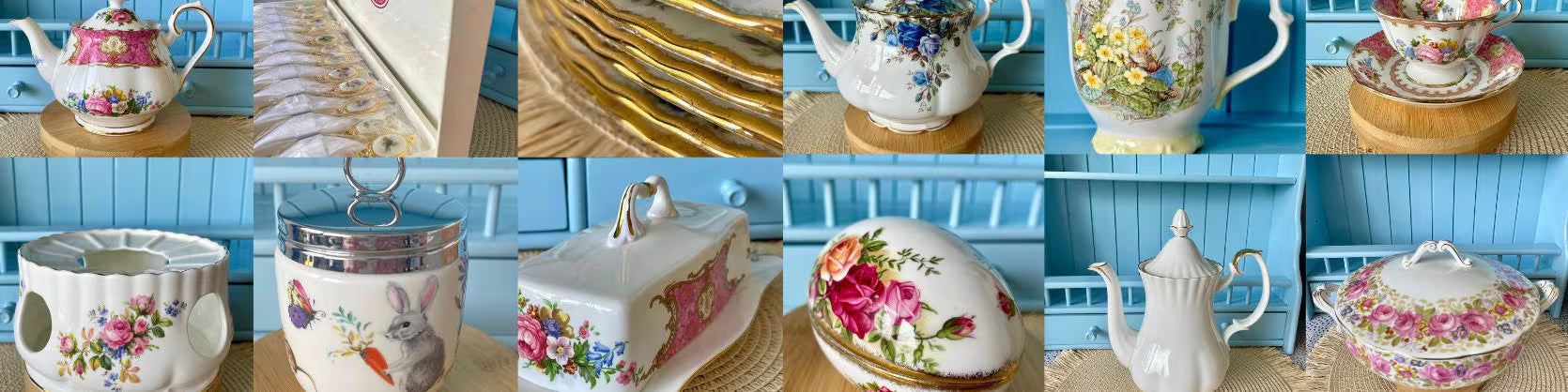 Explore our curated collection of vintage and antique teacups, fine china, and porcelain treasures from beloved brands including Royal Albert, Brambly Hedge, Herend, and more. Each piece is a timeless treasure waiting to find its perfect home.