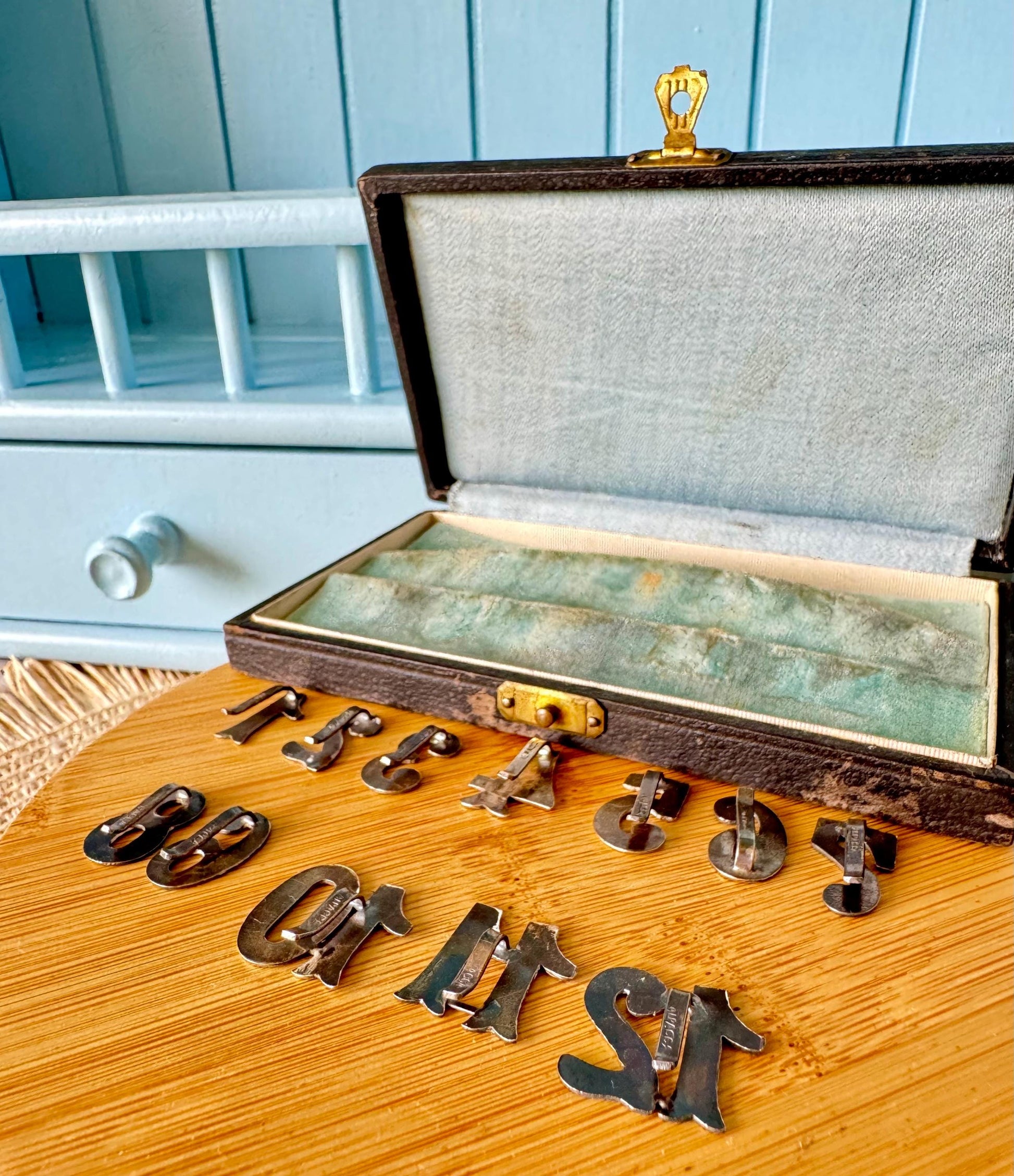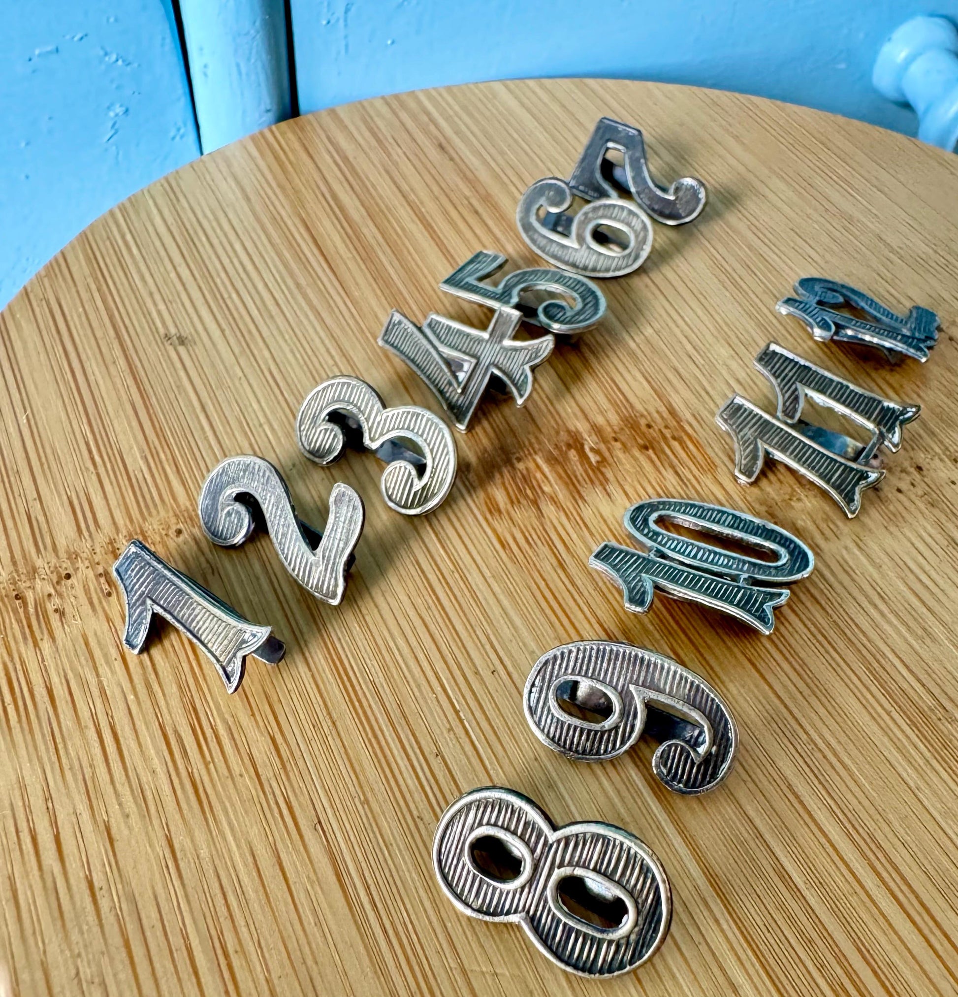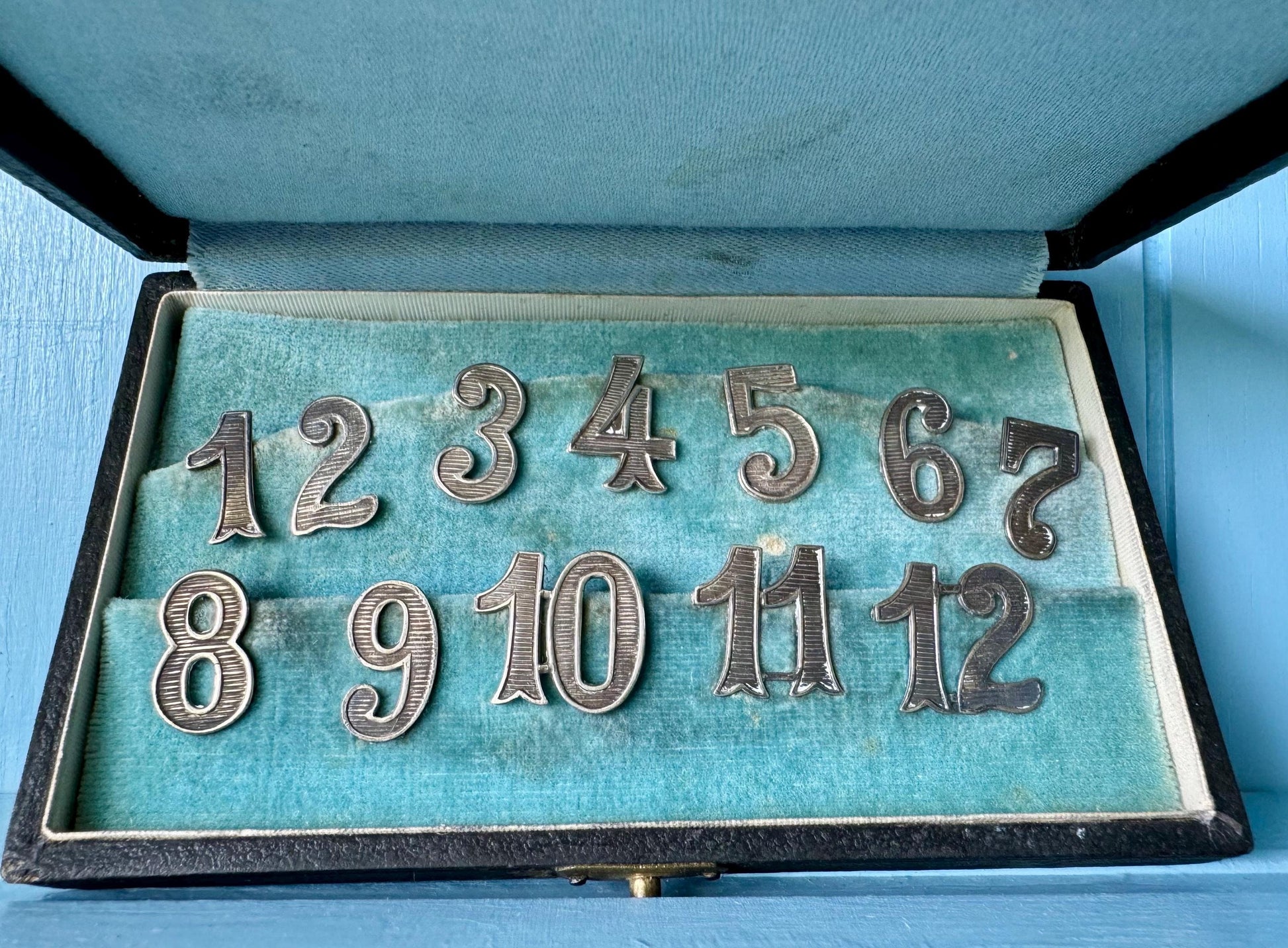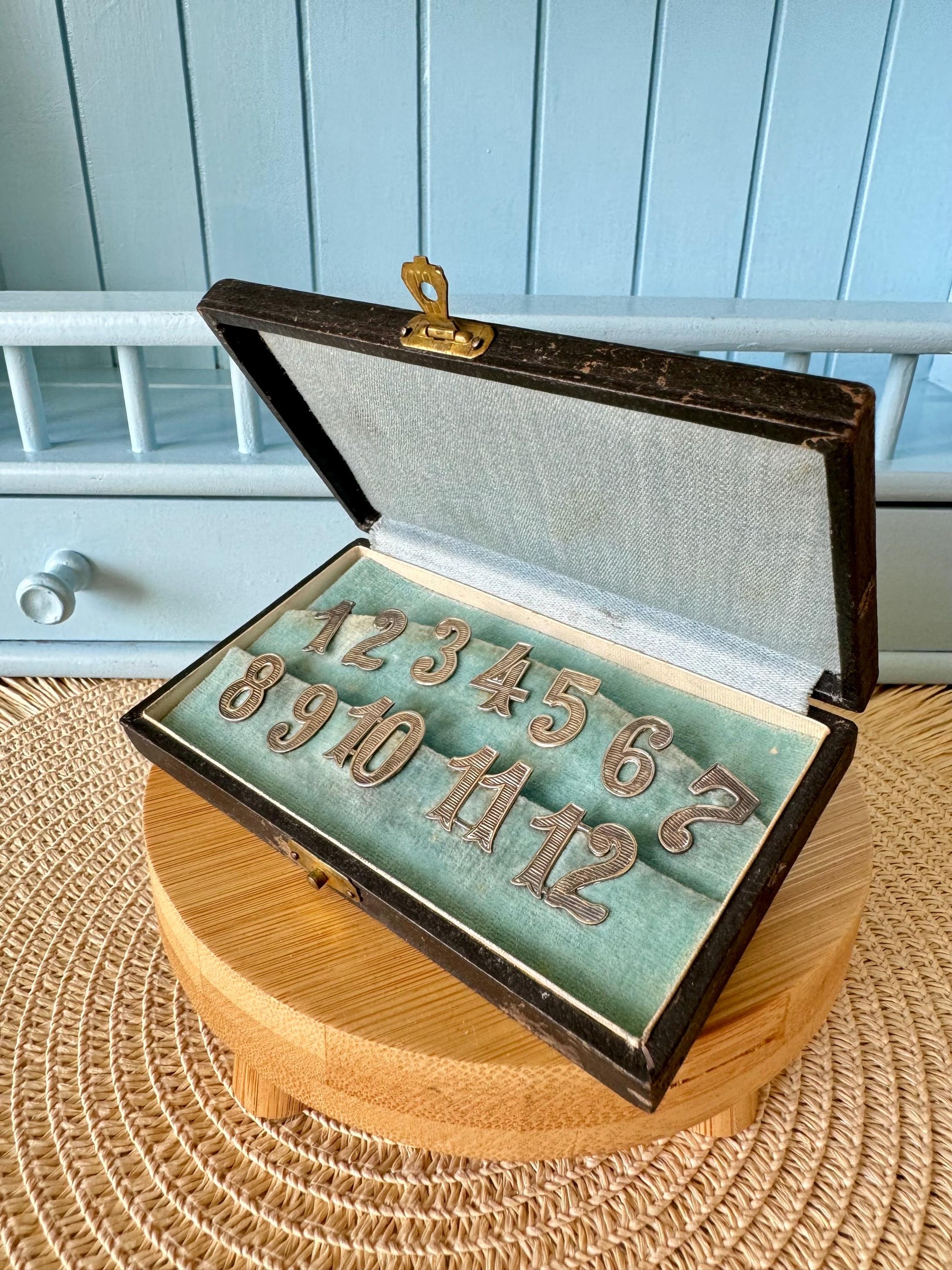 Dating back to the early 1900s, this exquisite set of 12 numbers is perfect for keeping track of glasses and adding a personalized touch to your table setting. The intricate Alpacca silver and beautiful decorations make them a standout piece.