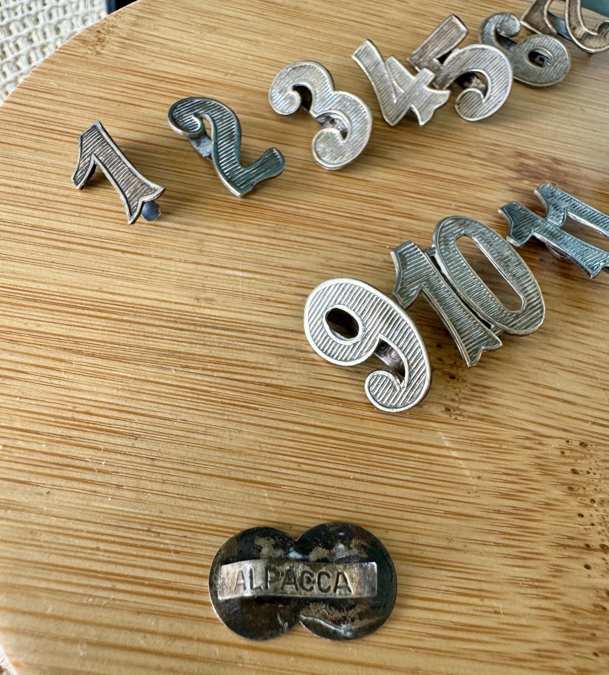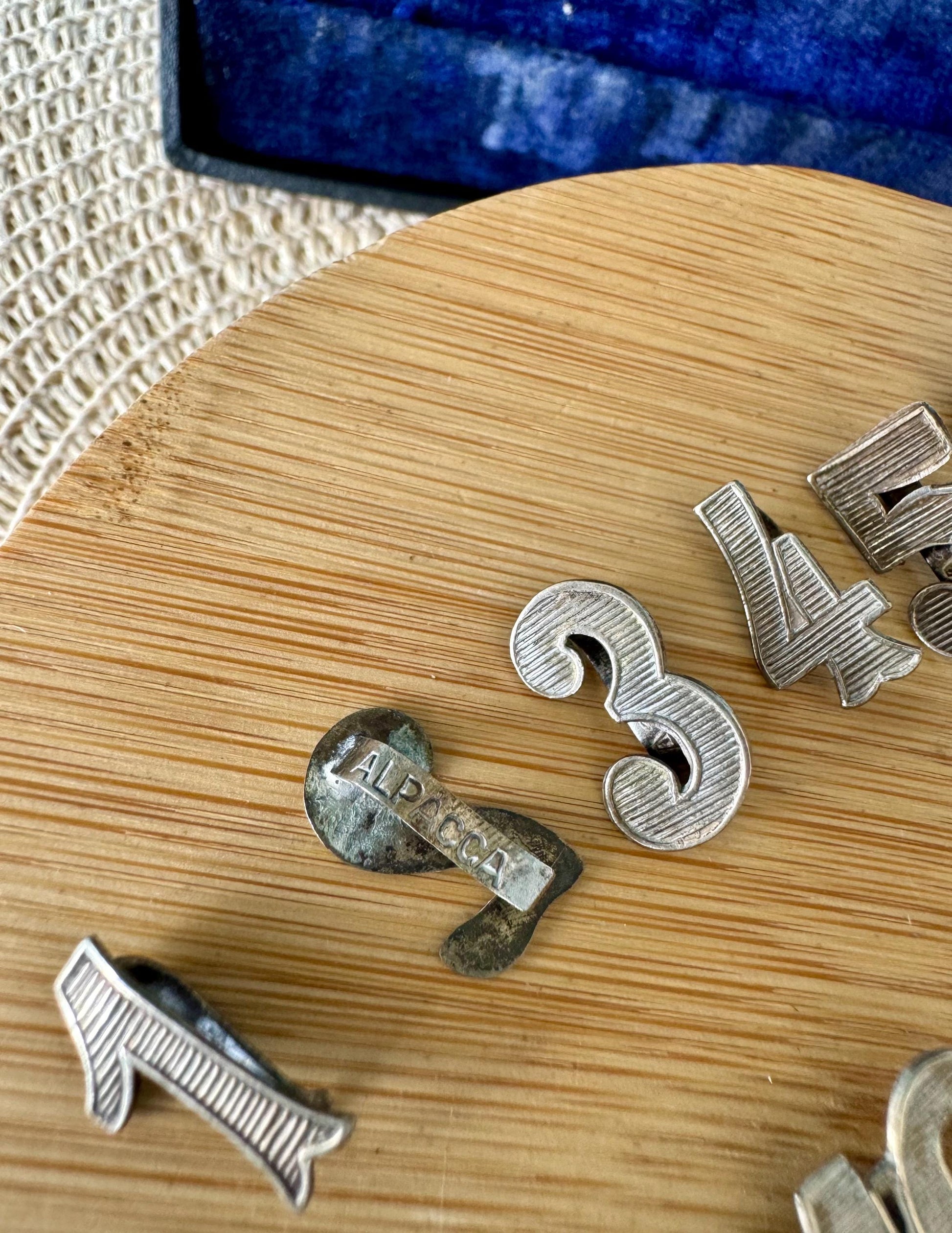 vintage, alpacca silver, wine numbers, wine charms, dinner party, decor, collectible, antique, 1900s