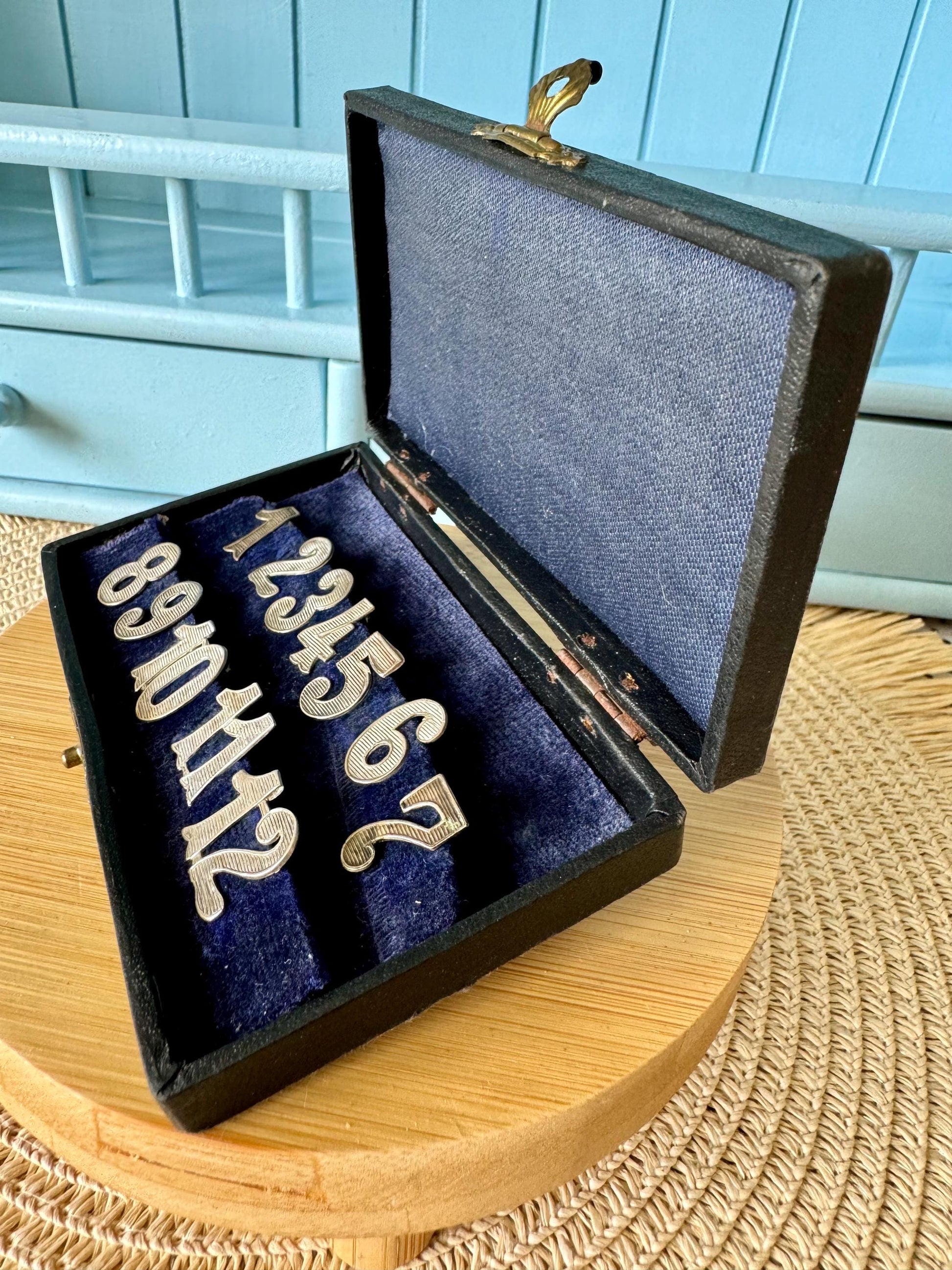 Dating back to the early 1900s, this exquisite set of 12 numbers is perfect for keeping track of glasses and adding a personalized touch to your table setting. The intricate Alpacca silver and beautiful decorations make them a standout piece.