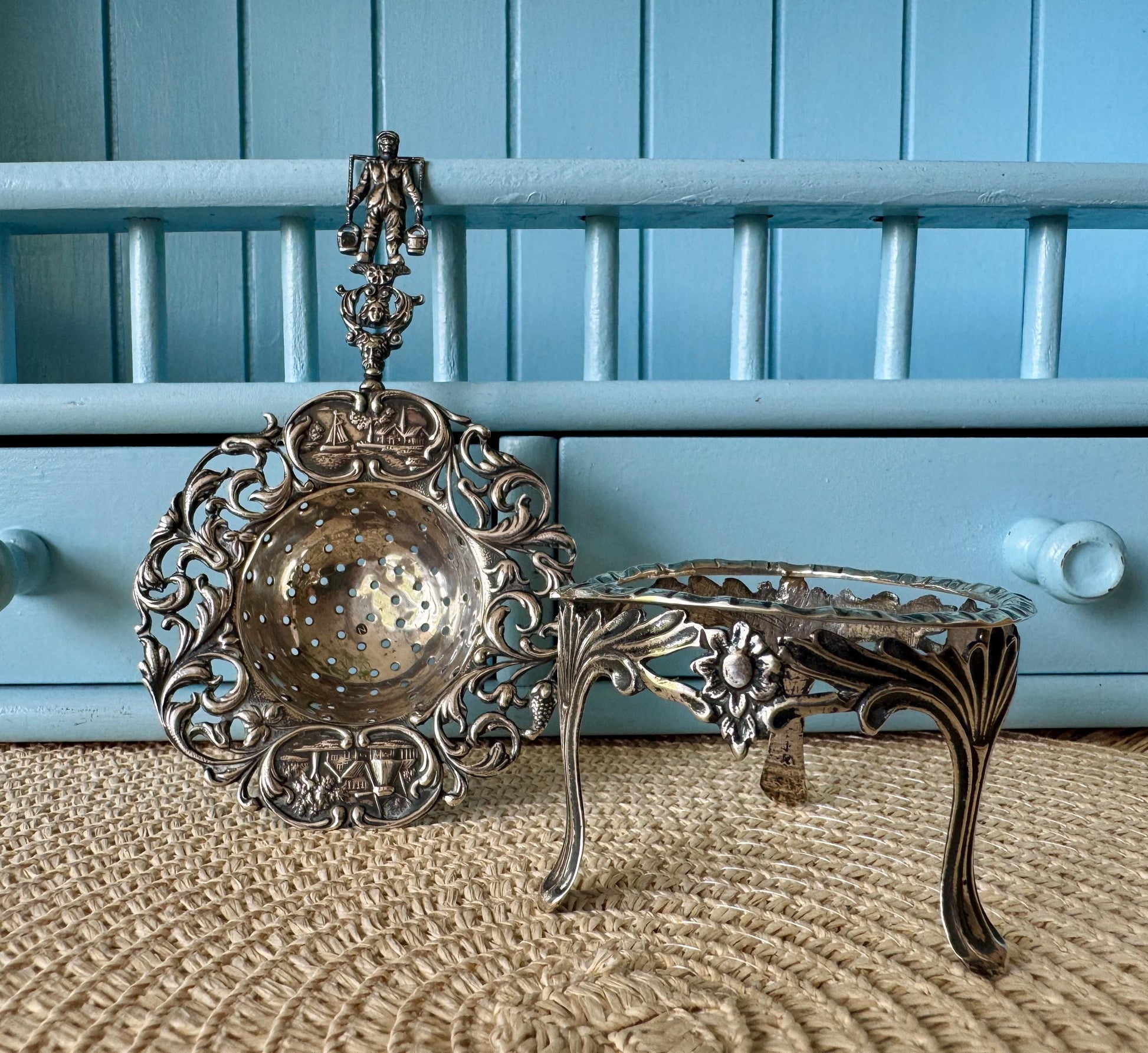 Antique Dutch Silver Tea Strainer & Stand