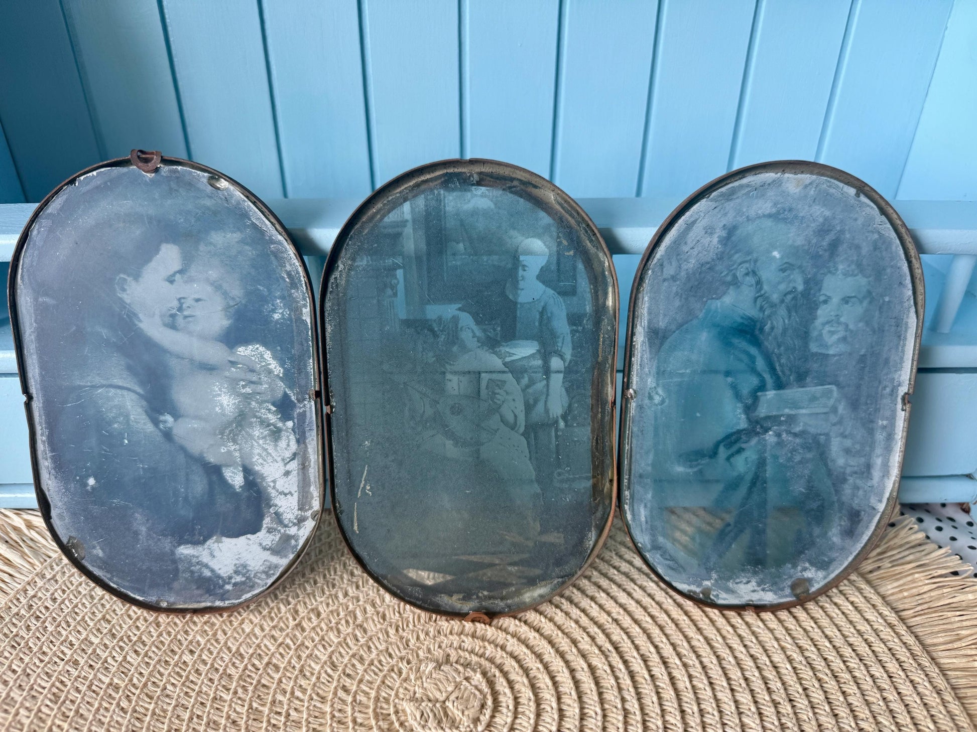 Antique Reverse Glass Paintings Set of 3, Religious & Genre Scene Wall Art, Hand-Painted Glass Panels c.1890-1910, Window Hangings, French