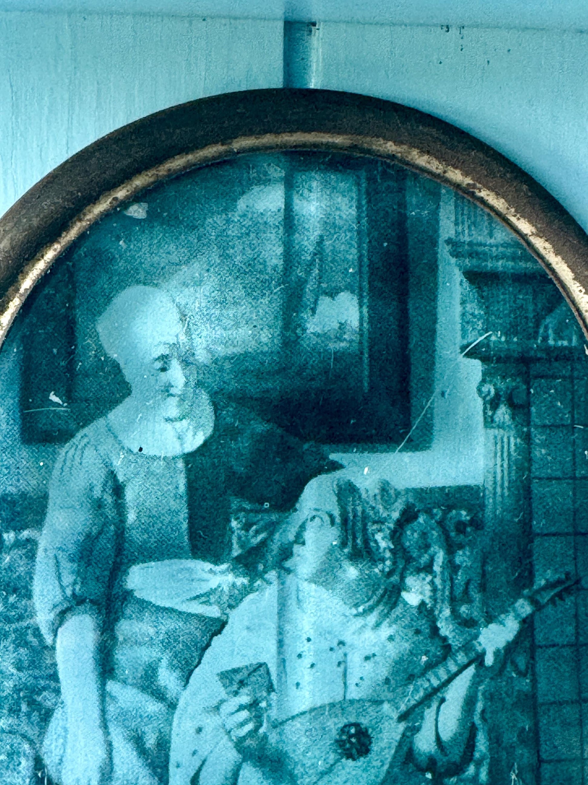 🖼️ Fall for the quiet, nostalgic charm of these three antique reverse-painted glass panels, each capturing a tender moment from long ago. Measuring 15 cm high and 9.5 cm wide, these delicate artworks were once made to hang in front of a window, where the light would gently illuminate their scenes.
