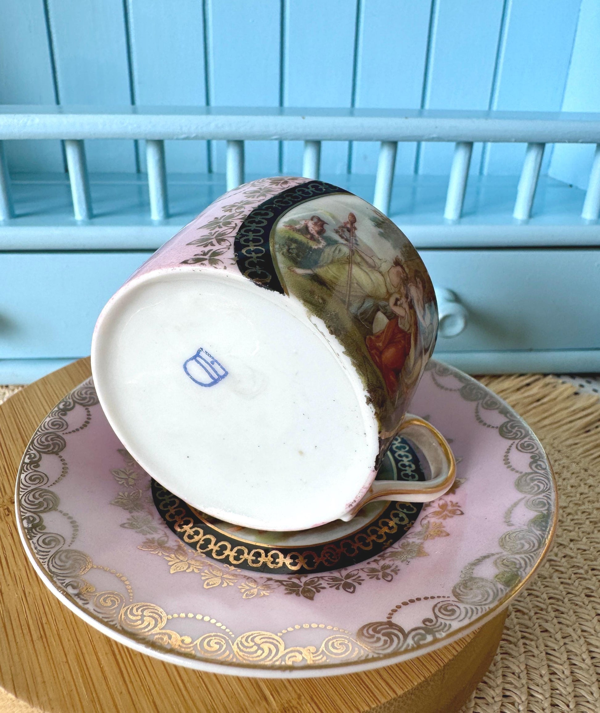 Antique Royal Vienna Fragonard Espresso Cup & Saucer, Beehive Mark Cup, Pink Gold Eggshell Porcelain, Matched Set, Vintage Romantic, Austria