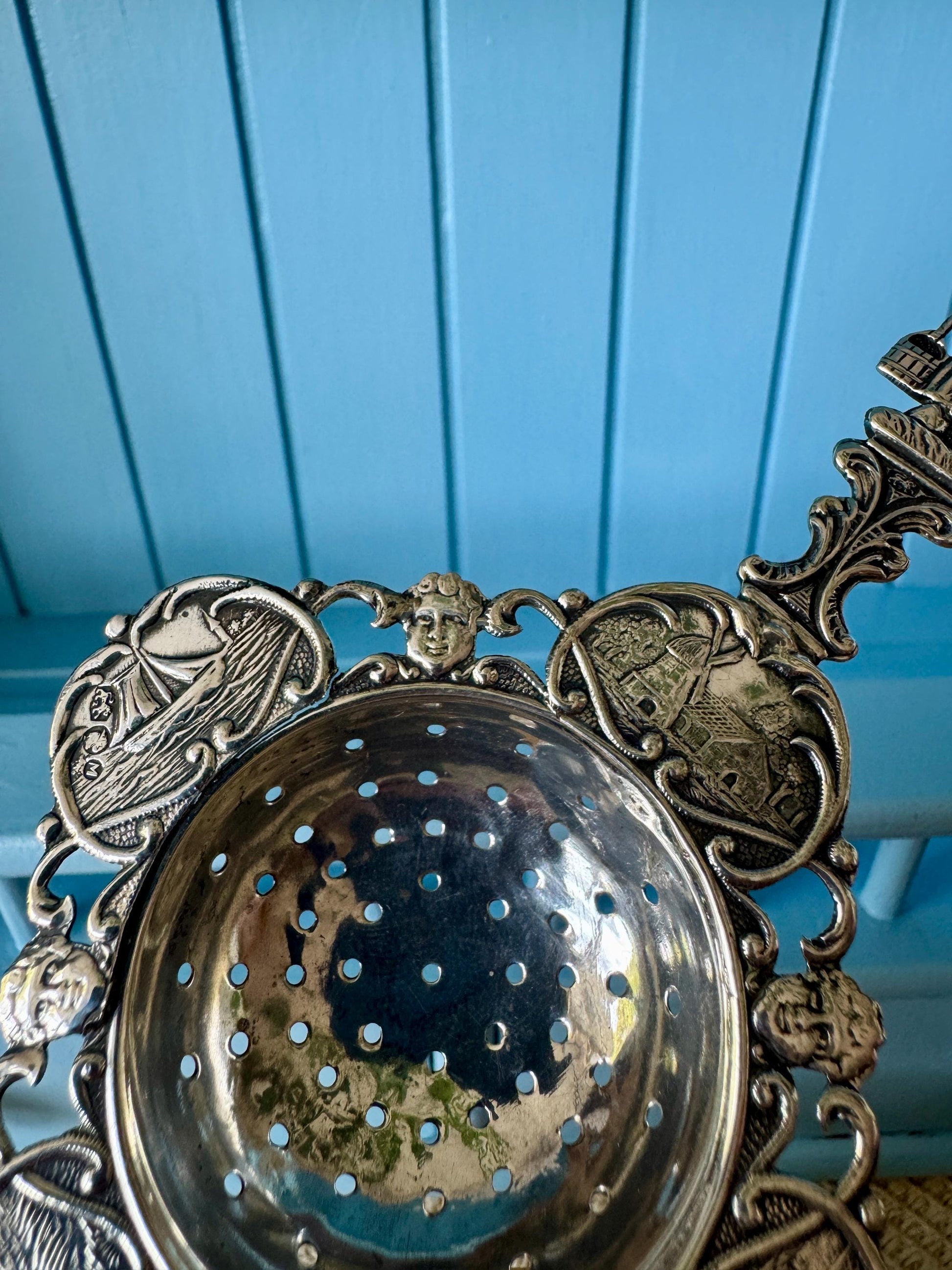 Antique Silver Tea Strainer, Early Edwardian Era, Dutch Themed, Milk Maid Handle, Silver Lion & Minerva Hallmarked Vintage Silverware, Dutch