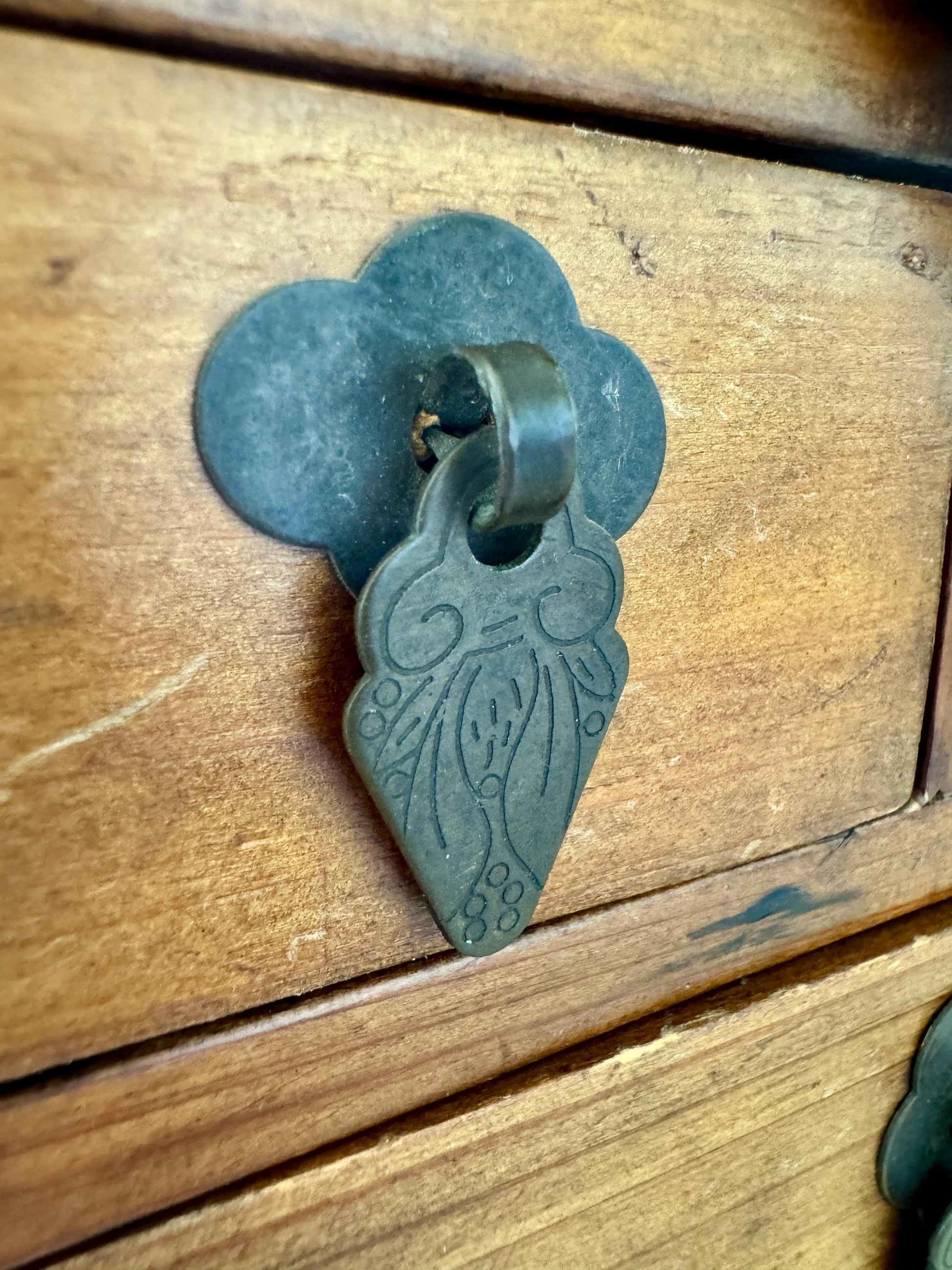 Featuring elegant brass drawer pulls and expertly crafted dovetail joints, this cabinet speaks to the quality of traditional craftsmanship. The oak has developed a soft patina, with gentle signs of age that only enhance its storied charm.