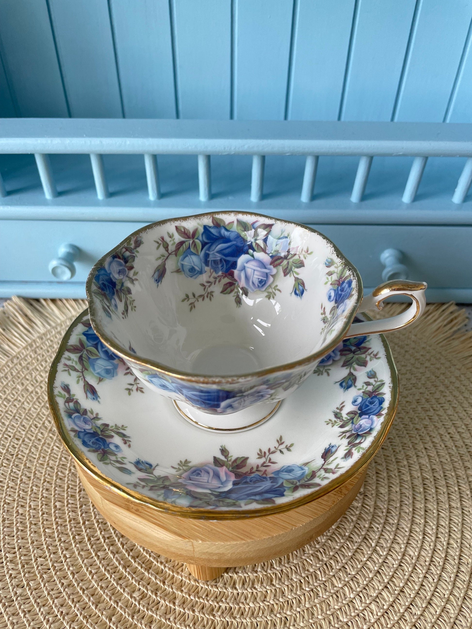 🌹 Vintage Charm with Character: Discover the allure of these Royal Albert Moonlight Rose teacups and saucers, a delightful blend of blue and lavender roses and a gilt rim in the Avon shape. While they bear the marks of time, their vintage charm tells a story.