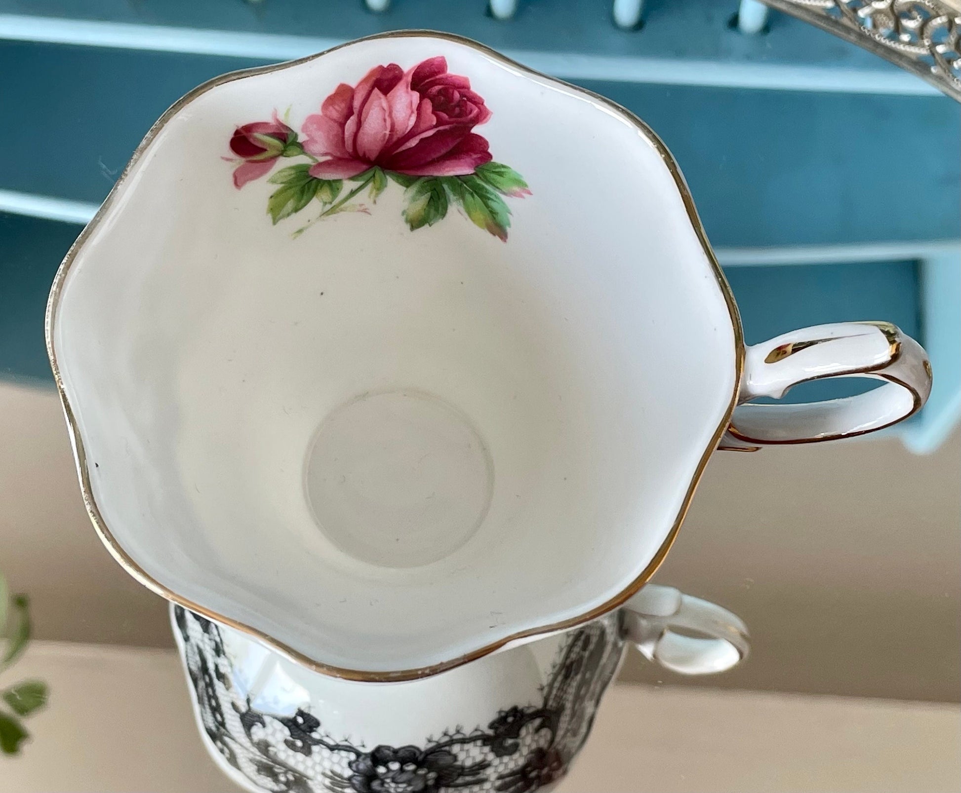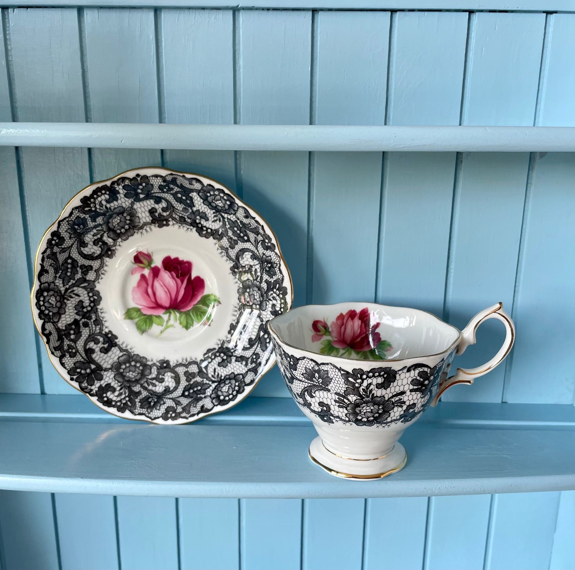 🖤 Vintage Royal Albert Senorita Teacup and Saucer 🖤 This vintage Royal Albert Senorita teacup and saucer is a stunning example of mid-century design. The black lace pattern with pink roses and gold accents is both elegant and eye-catching. 🖤 Key Features: ~ Vintage Charm: A piece of history, perfe...