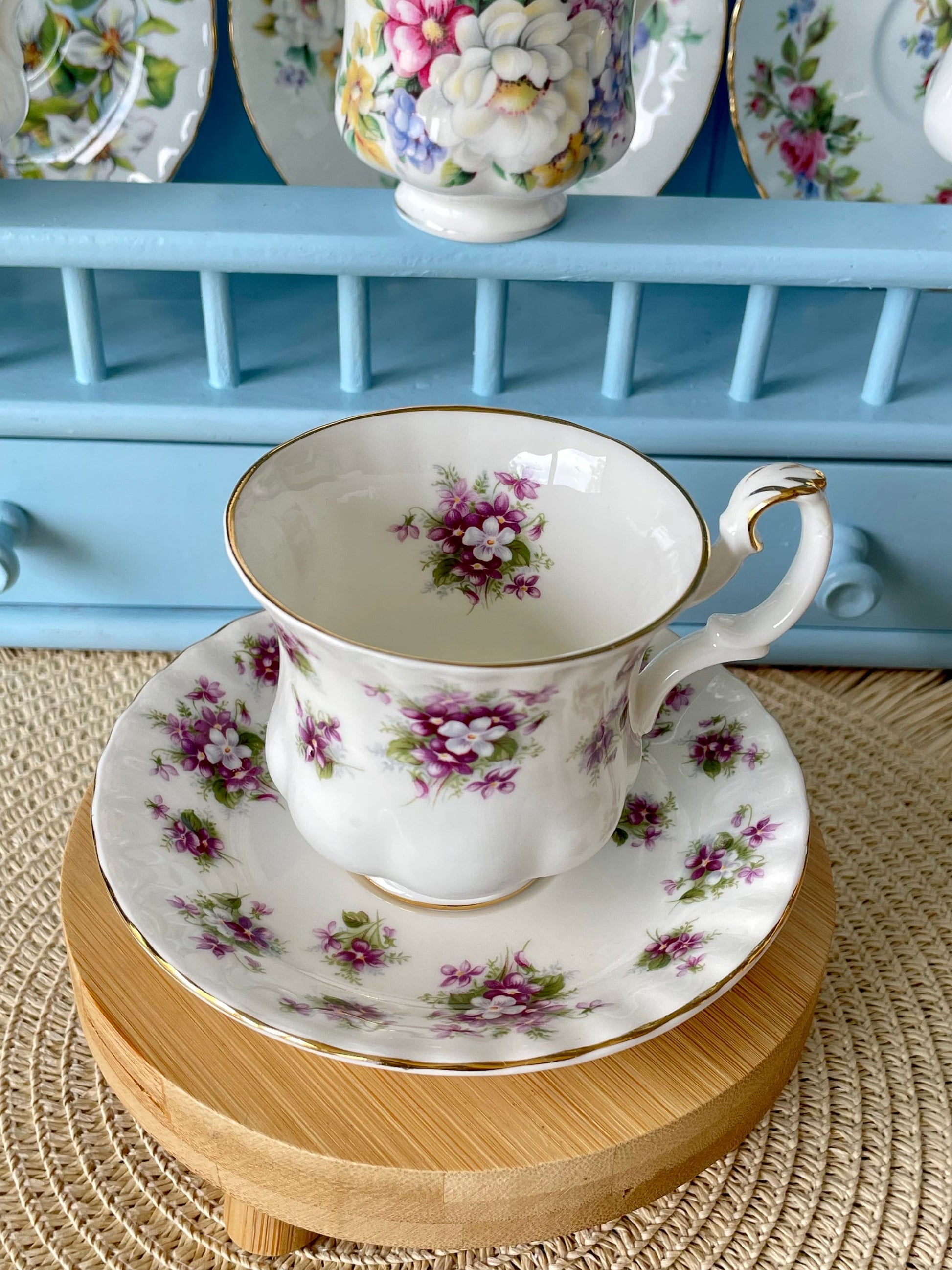 Ladies sized cup and saucer by ROYAL ALBERT England: sweet violets Dainty purple violets on green foliage are sprinkled on this Montrose shaped cup and saucer. Fine lined gold gilt trim is found on the foot, handles and rims. This is a teacup and saucer made in England by Royal Albert in the Sweet...