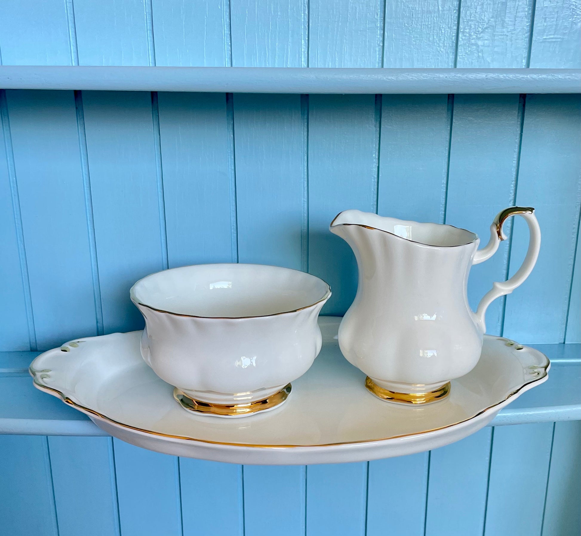 Experience the charm of this exquisite Royal Albert Val D'or creamer set. Crafted with crisp white porcelain and adorned with elegant golden accents, these timeless pieces evoke a sense of beauty and sophistication. The set includes: a sugar bowl a milk jug and a presentation platter, all made ...