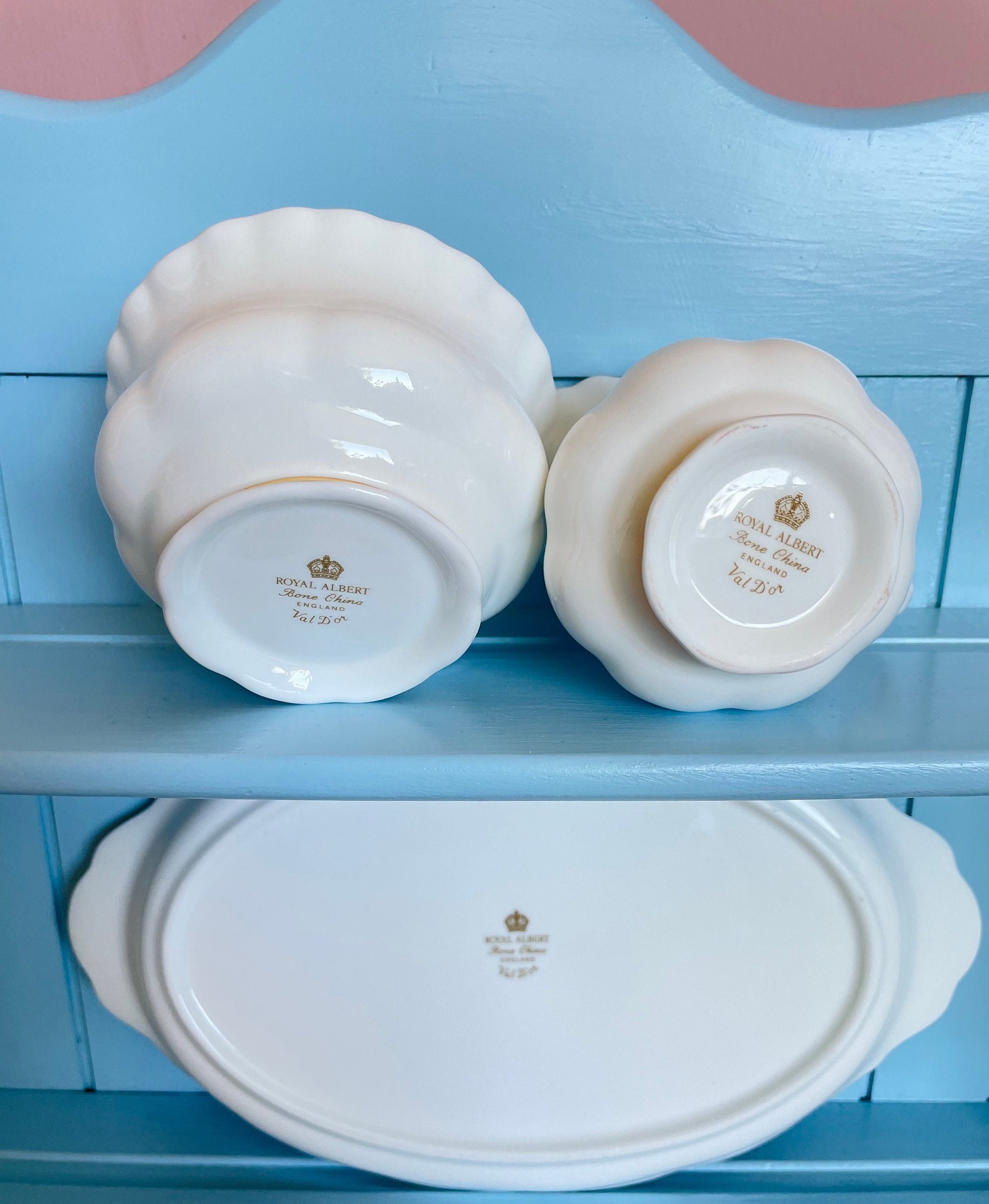 Crisp White Royal Albert "Val D'Or" Gold Creamer Set, Sugar Bowl, Milk Jug & Platter, Bone China England, Previously Loved Vintage, High-Tea
