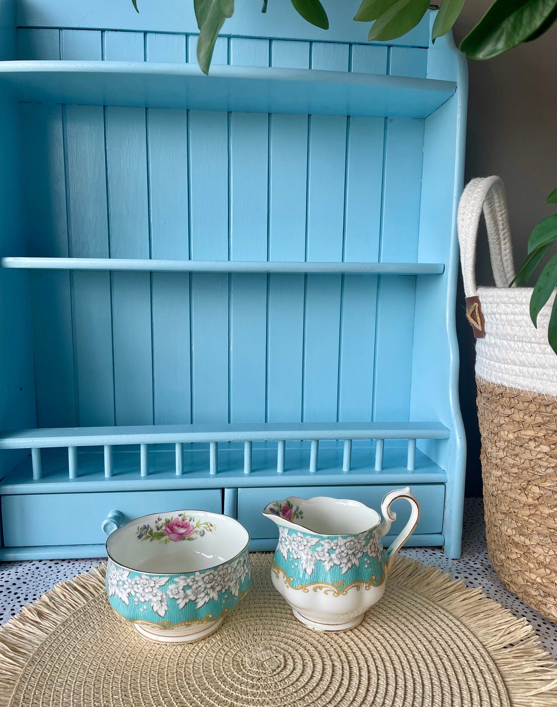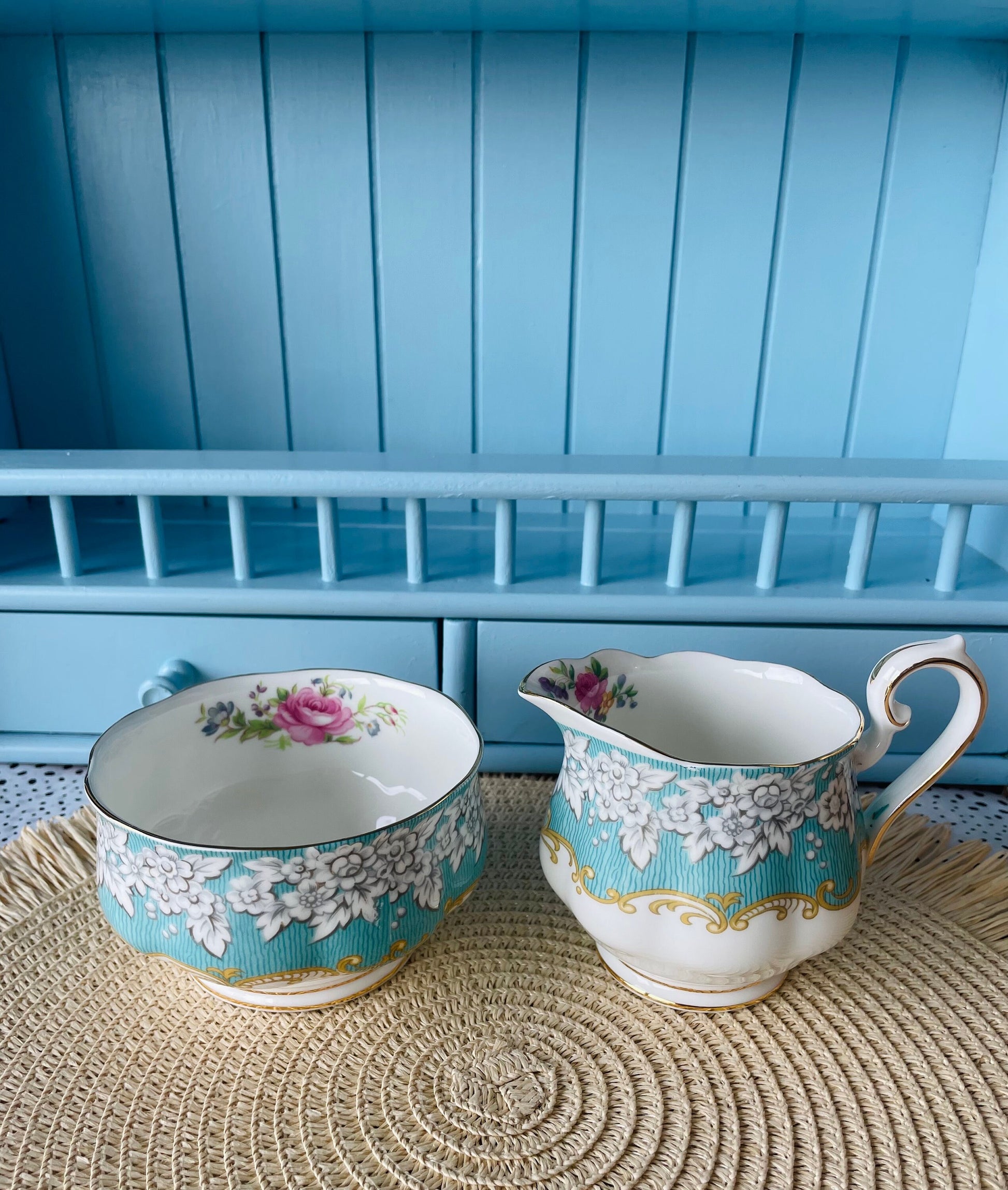 ✨ Enchantment Tea Set✨ Elevate your tea experience with this rare and hard to find Enchantment large creamer set from Royal Albert. These two stunning pieces feature delicate baby blue floral patterns, an ornate gold border, and intricate scrollwork. ~~ Specifications ~~ 🥛 1 x Milk Jug: 8.5 cm / 3....