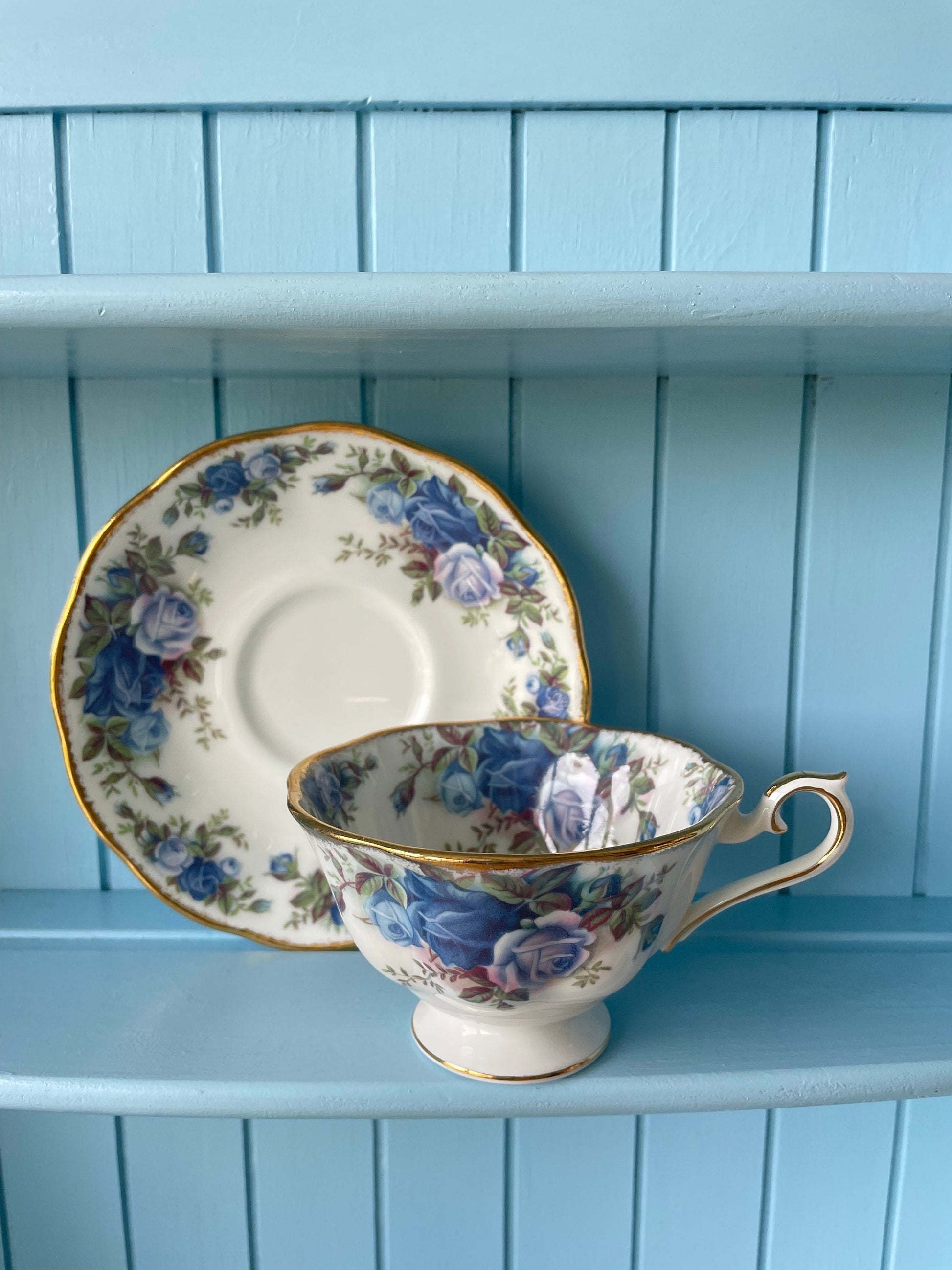 Pristine Avon Shaped Royal Albert "Moonlight Rose" Teacup & Saucer, Fine Bone China, Blue Roses Decor, Highly Sought After, Made in England