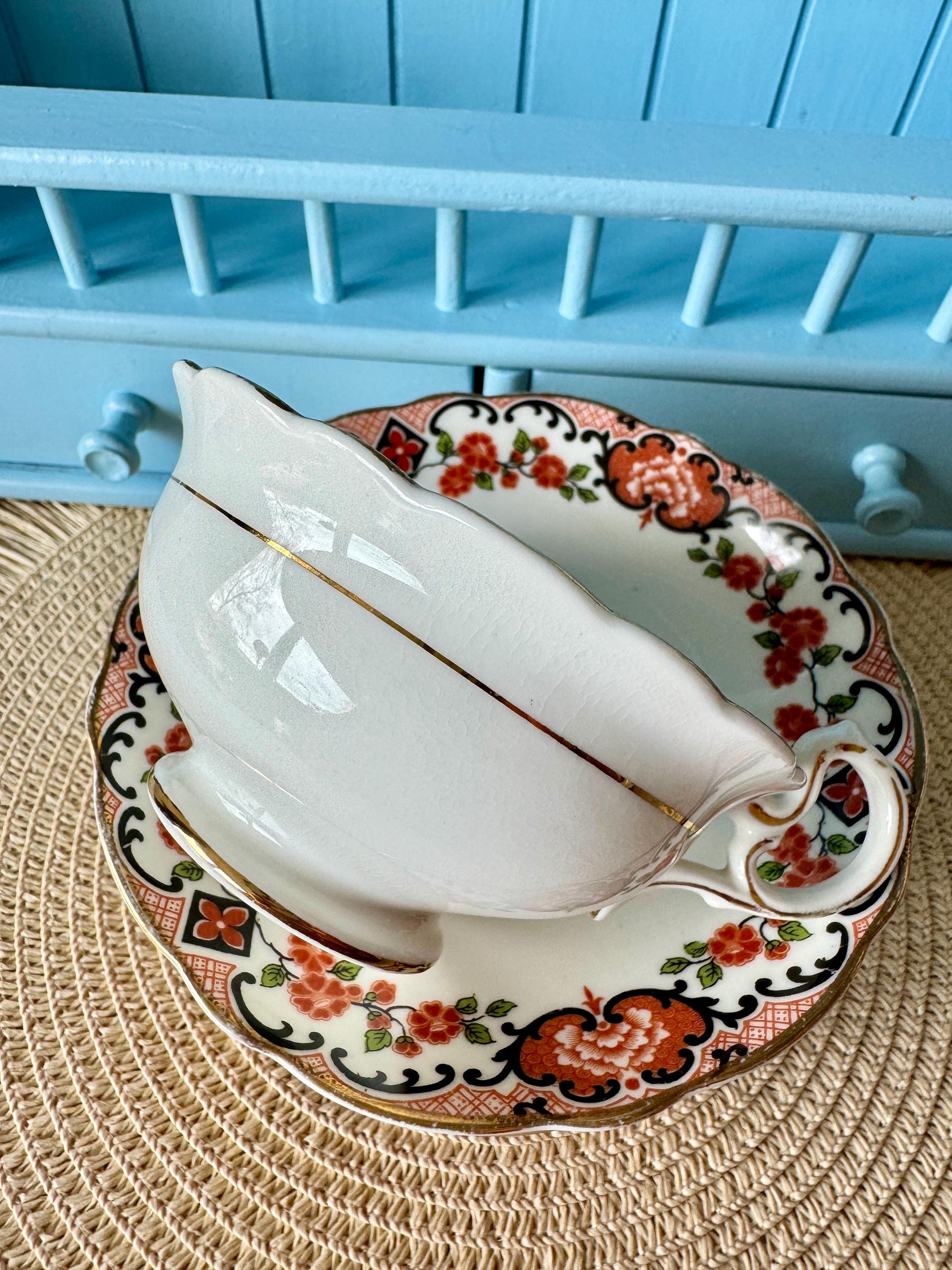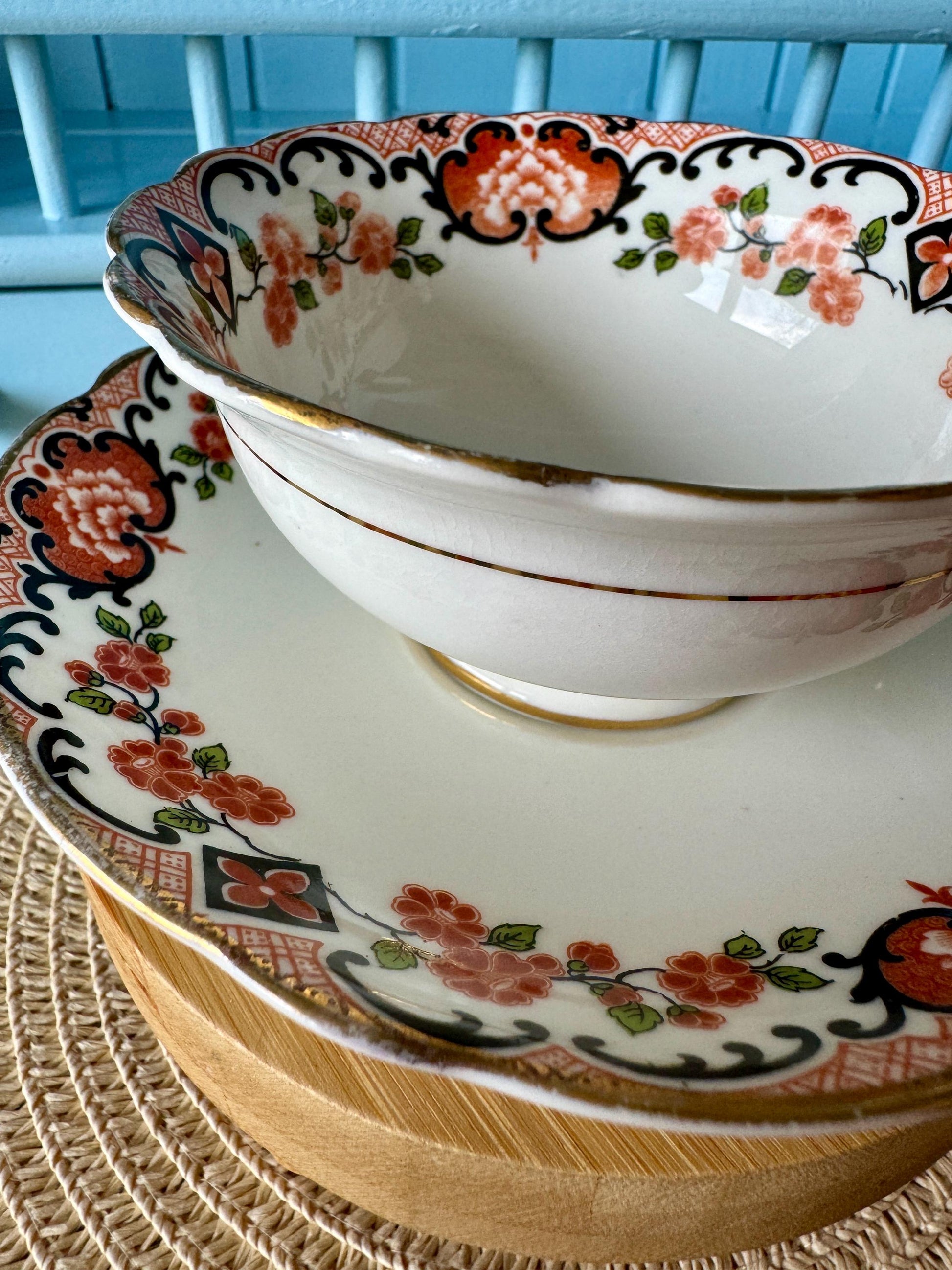 ❤️ Vintage Aynsley Teacup and Saucer Set ❤️ Discover this charming vintage Aynsley teacup and saucer set, dating back to the mid-20th century. Crafted with fine bone china, this set features a captivating design of red accents, dark blue accents, delicate roses, and lush green foliage. ❤️ Key Feat...