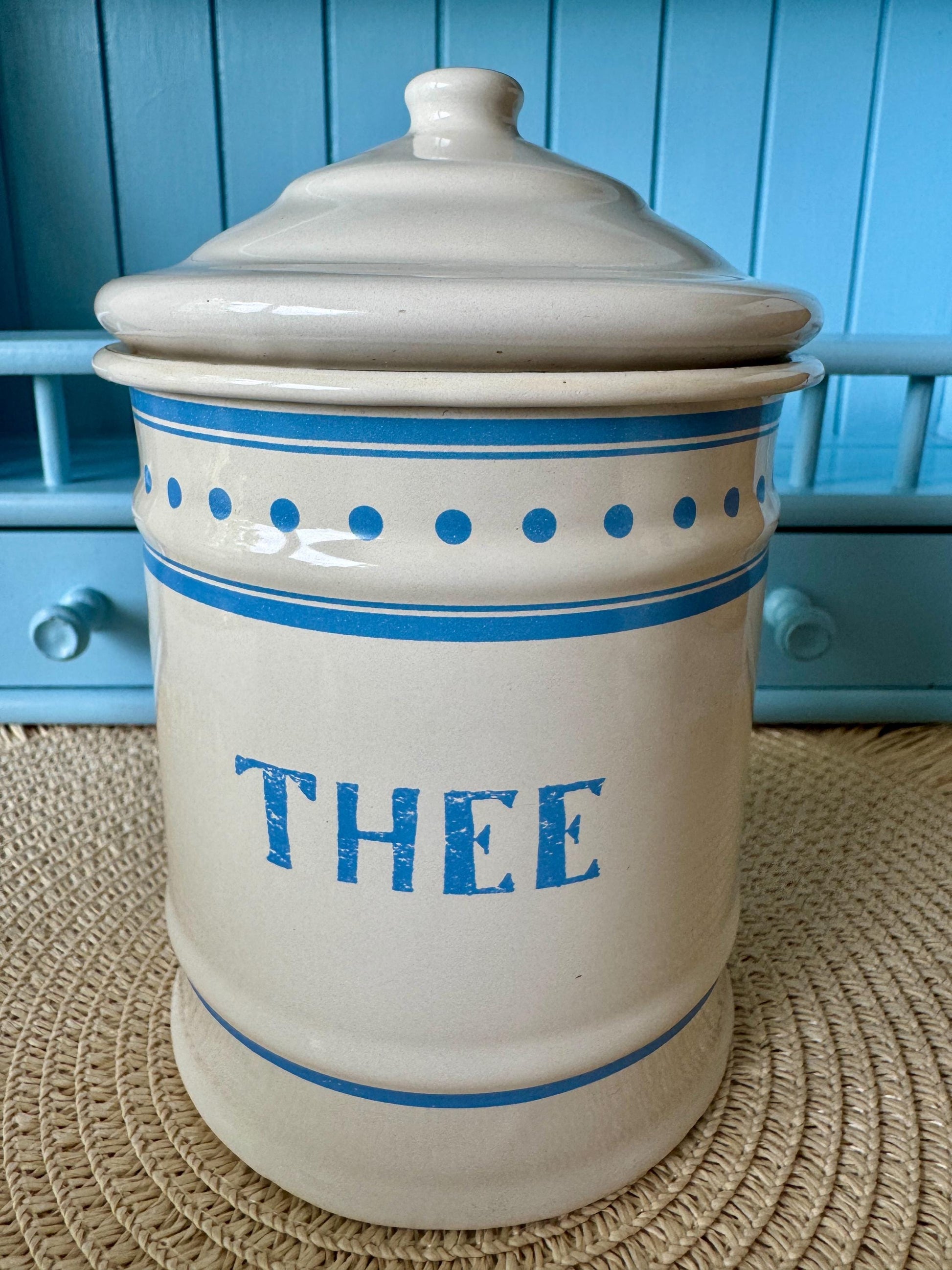 ⭐️ Add a touch of nostalgic Dutch charm to your kitchen with this stunning set of vintage enamel storage containers. Labeled in soft baby blue lettering – Koffie (Coffee), Suiker (Sugar), and Thee (Tea) – these beautifully preserved jars are a true delight for lovers of timeless design.