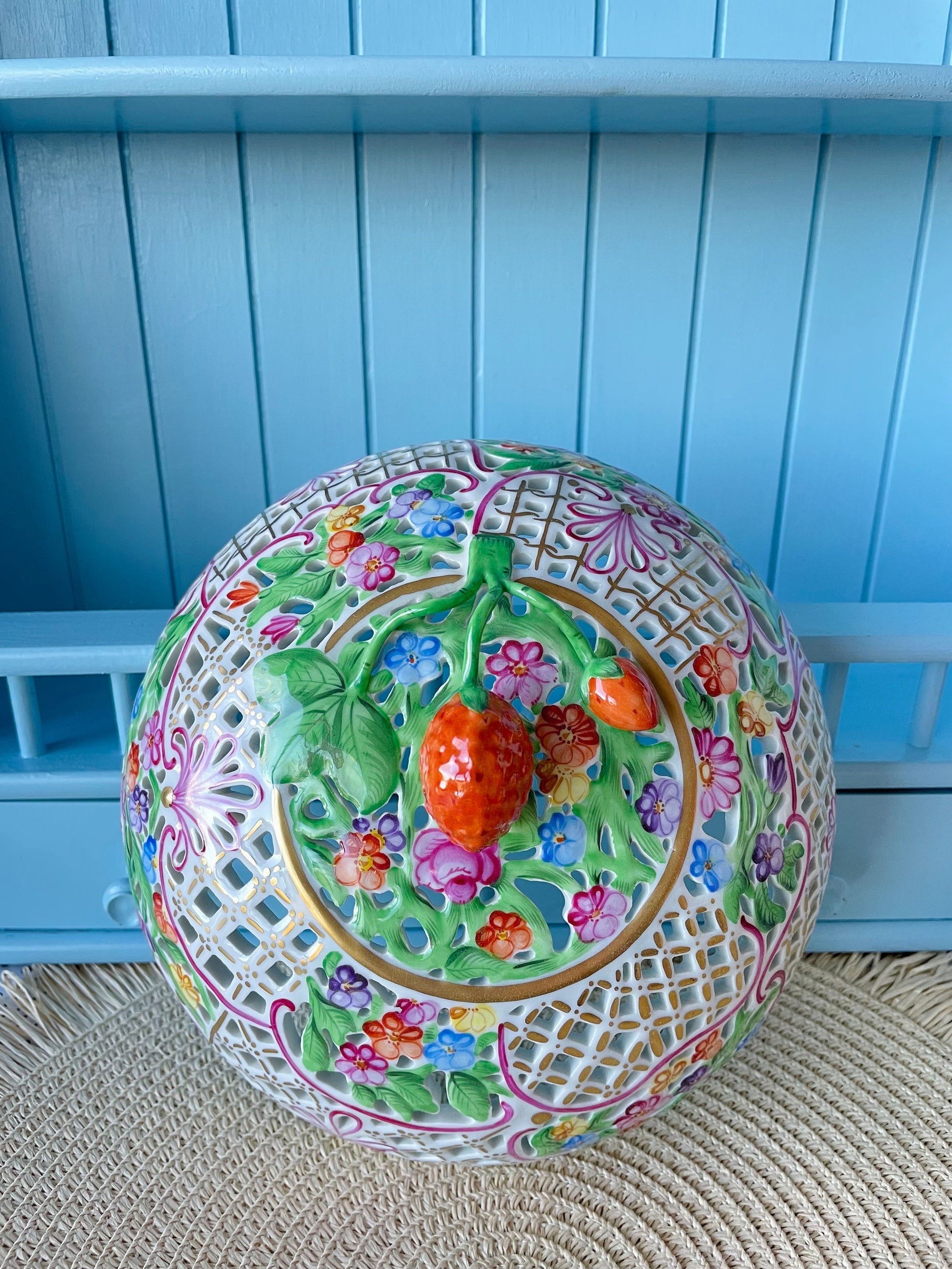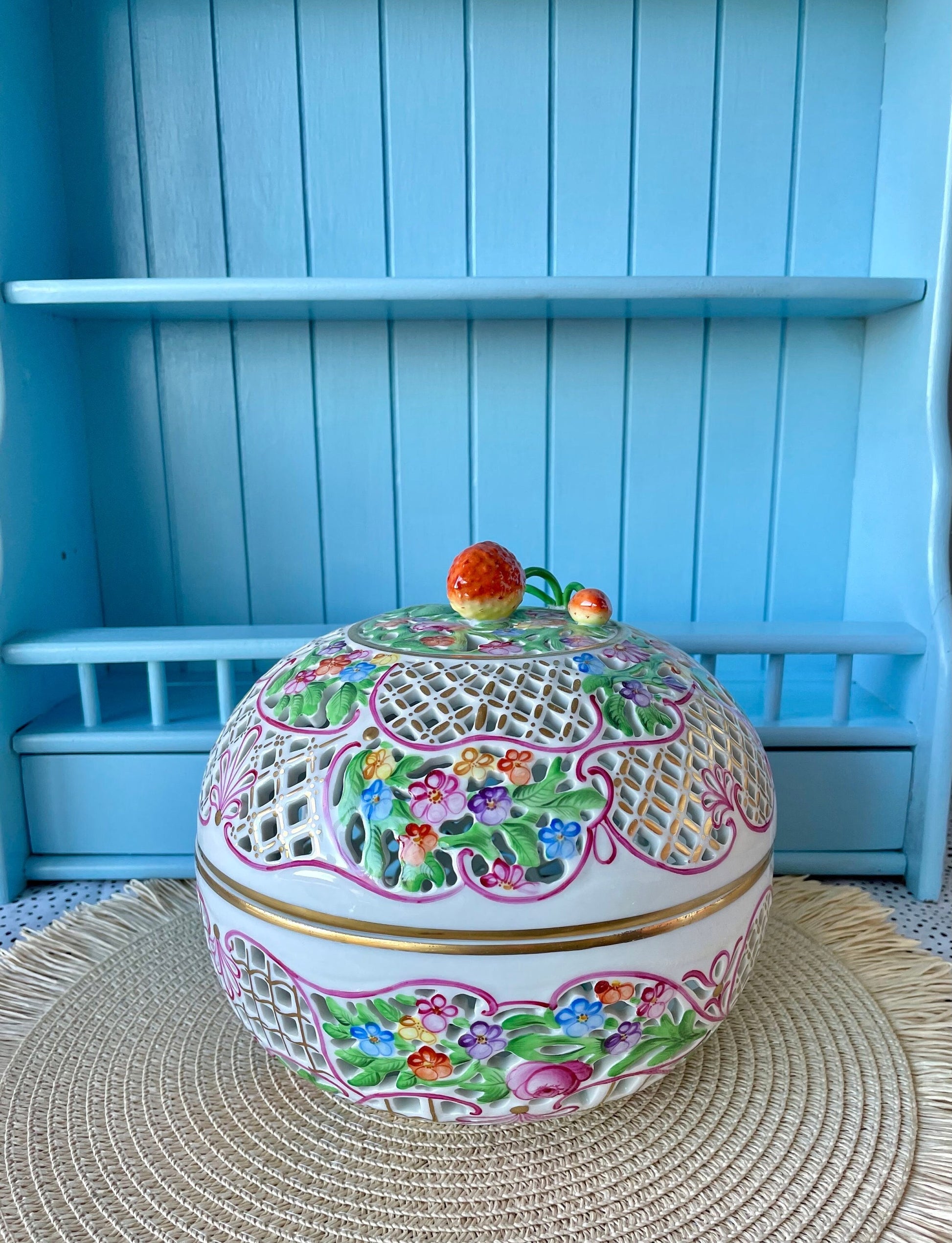 🍓 This stunning '90s Herend Porcelain bonbonniere, model 6211, is a rare and exquisite piece. Hand-painted with intricate floral details, featuring a captivating openwork design, and adorned with adorable strawberry-shaped knobs, it's a true collector's item.