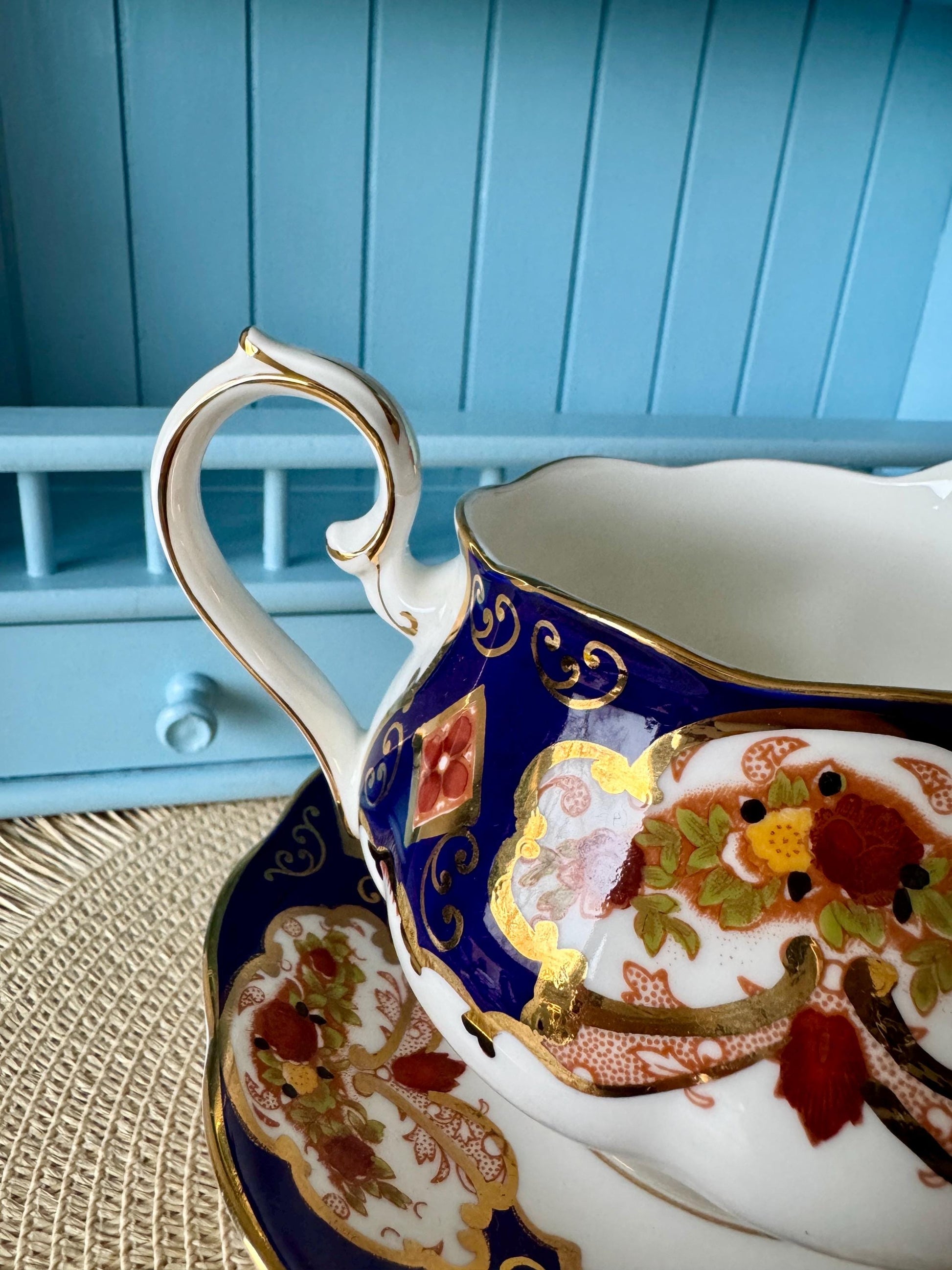 Immerse yourself in the captivating beauty of the Royal Albert Heirloom series, featuring its signature cobalt blue, vibrant orange hues, and swirling golden accents. This exquisite gravy boat and underplate set exudes timeless sophistication and is the perfect centerpiece for elegant dining.