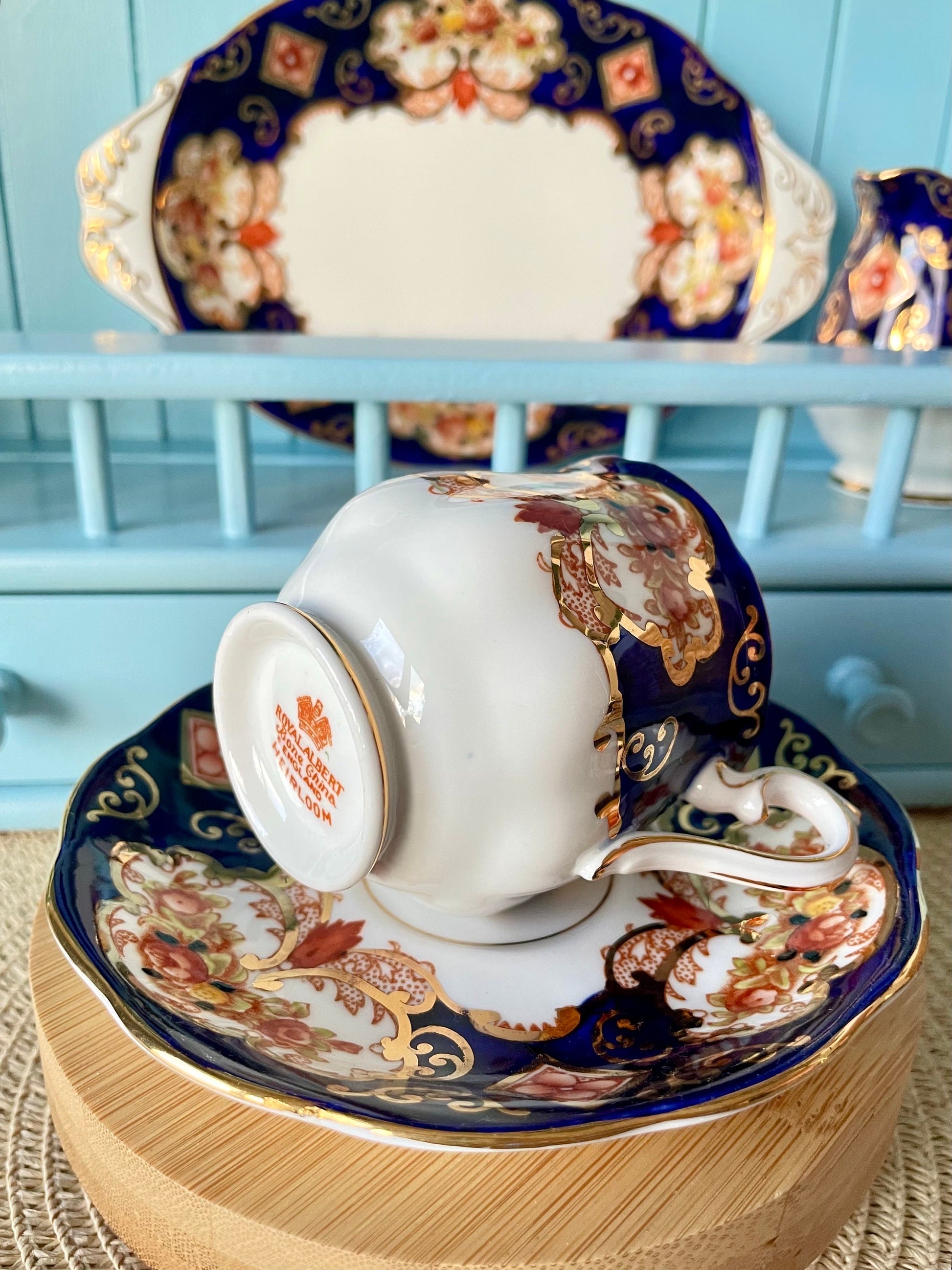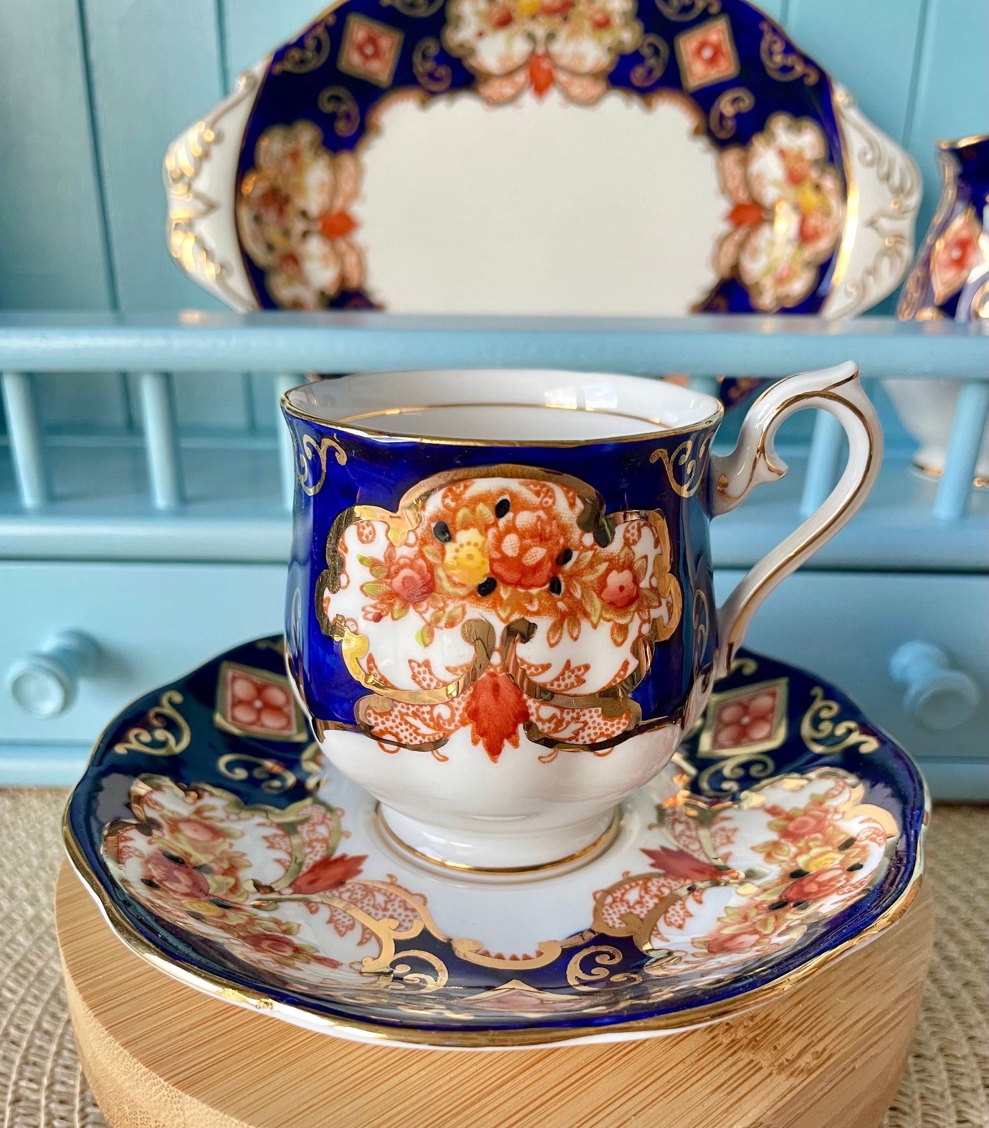 Two beautiful Royal Albert Heirloom espresso cups and saucers made in England. Japanese Imari pattern in Autumn colours (orange, tan, yellow and green) on a Cobalt Blue rim, with rich gold accents. Gold trim and scalloped edges. Ornate handles. Coffee/Espresso Cup, Cobalt Blue Orang Gold Imari, Vin...