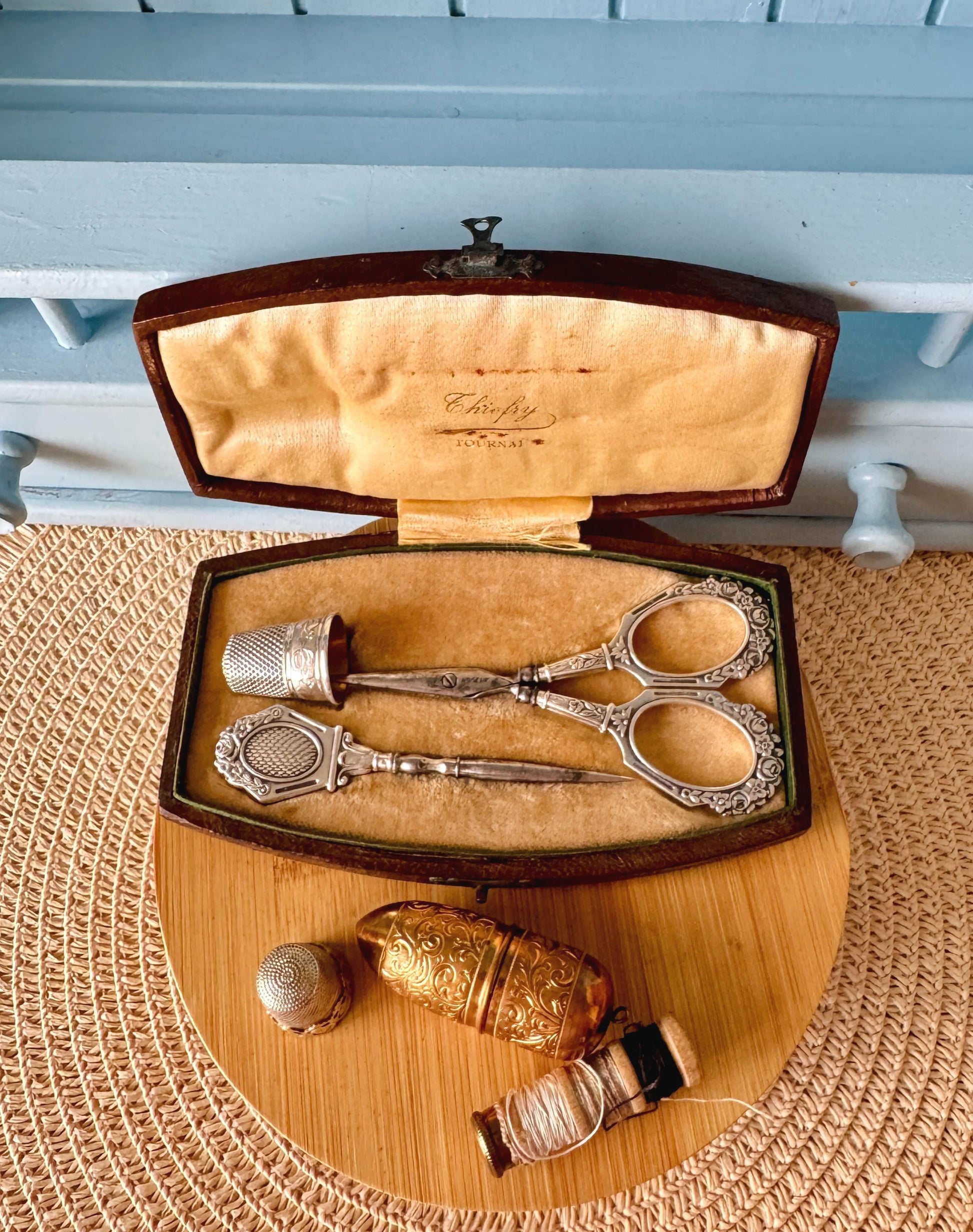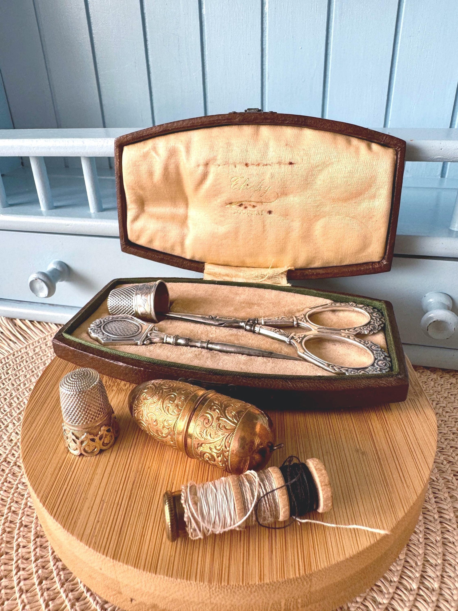 Antique French & Belgian Silver Sewing Sets | Victorian Scissors & Thimble | Rare Etui Cases Step into the elegance of the 19th century with this rare duo of antique sewing sets. Each piece reflects the artistry and refinement of its time, practical tools transformed into miniature works of art, che...
