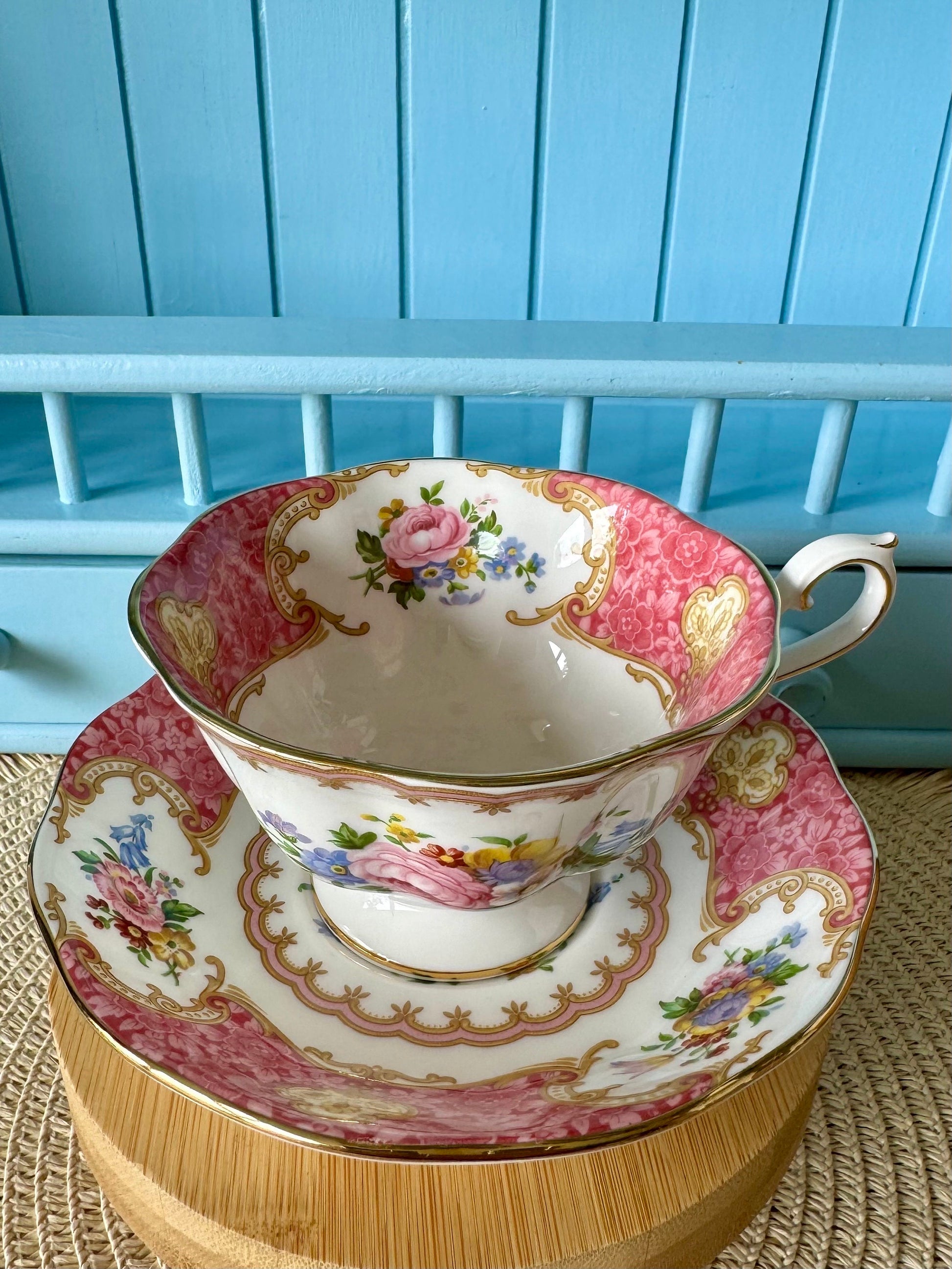 Uncommon Beauty: This captivating teacup and saucer set from Royal Albert's beloved Lady Carlyle pattern features a rare and highly sought-after design. Unlike most Lady Carlyle sets, where the floral sprays decorate the interior, these feature the florals on the outside of the cup. This unique twist makes them a true collector's item.