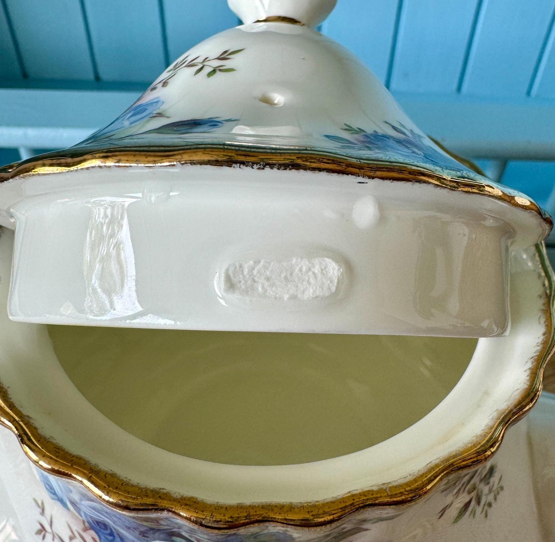This captivating Royal Albert teapot showcases the stunning Moonlight Rose design in vibrant blues and purples. The gold trim on the pot and lid is flawless, adding a touch of elegance. Â
