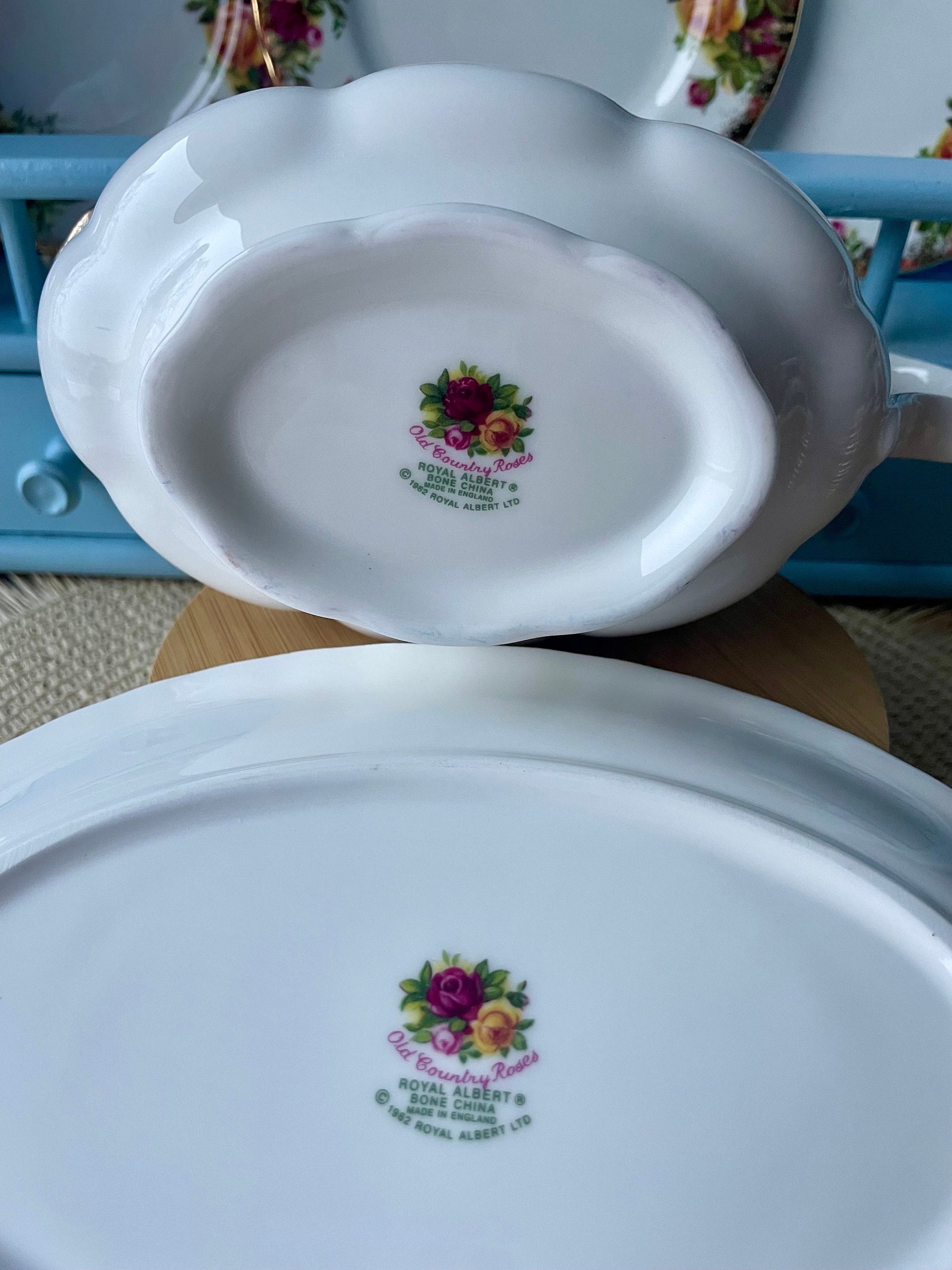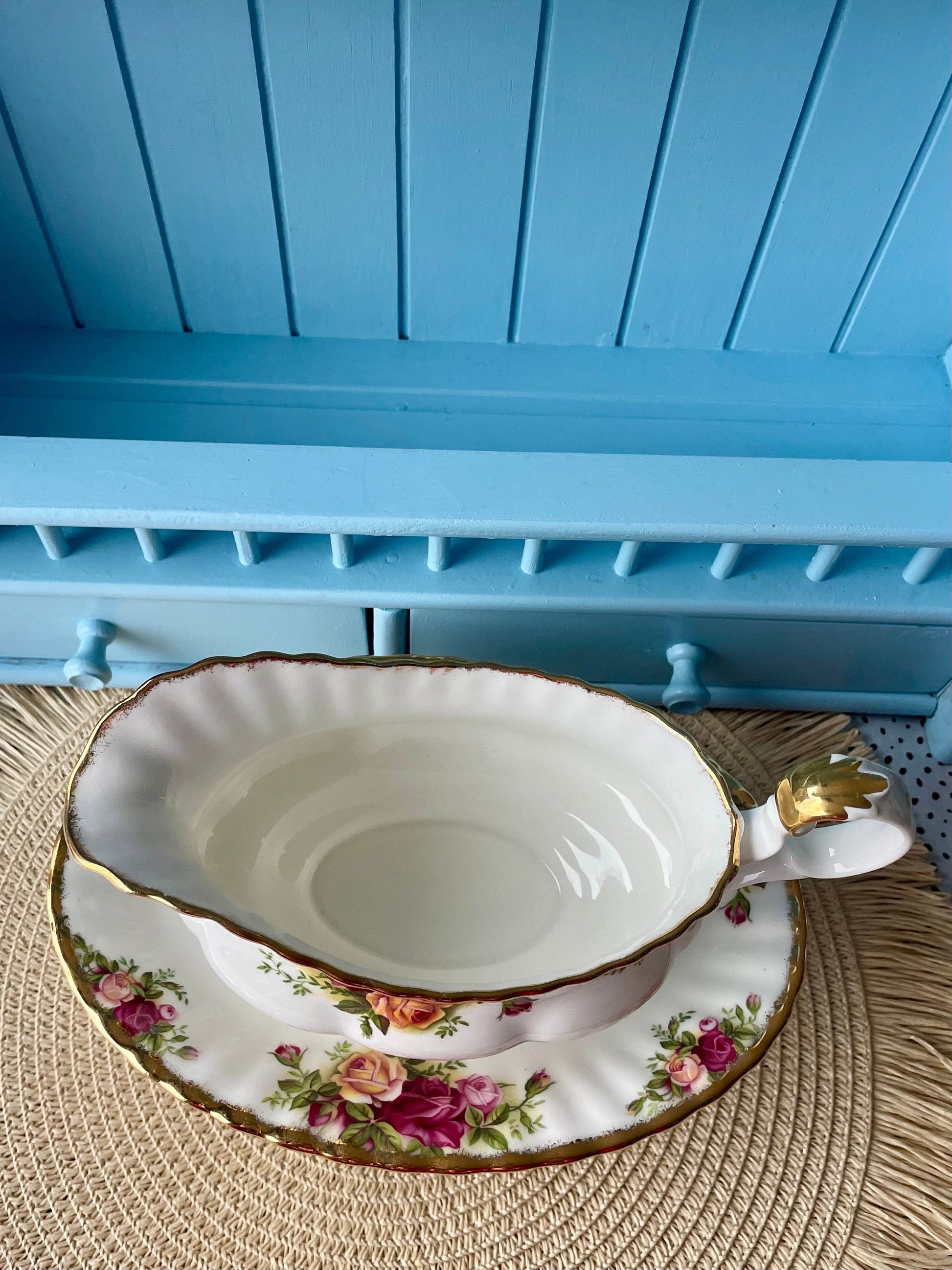 Very Rare Hard To Find Royal Albert "Old Country Roses" Gravy Jar on Platter, Beautiful Thick Gold, Fine Bone China, Red Rose Decor, England