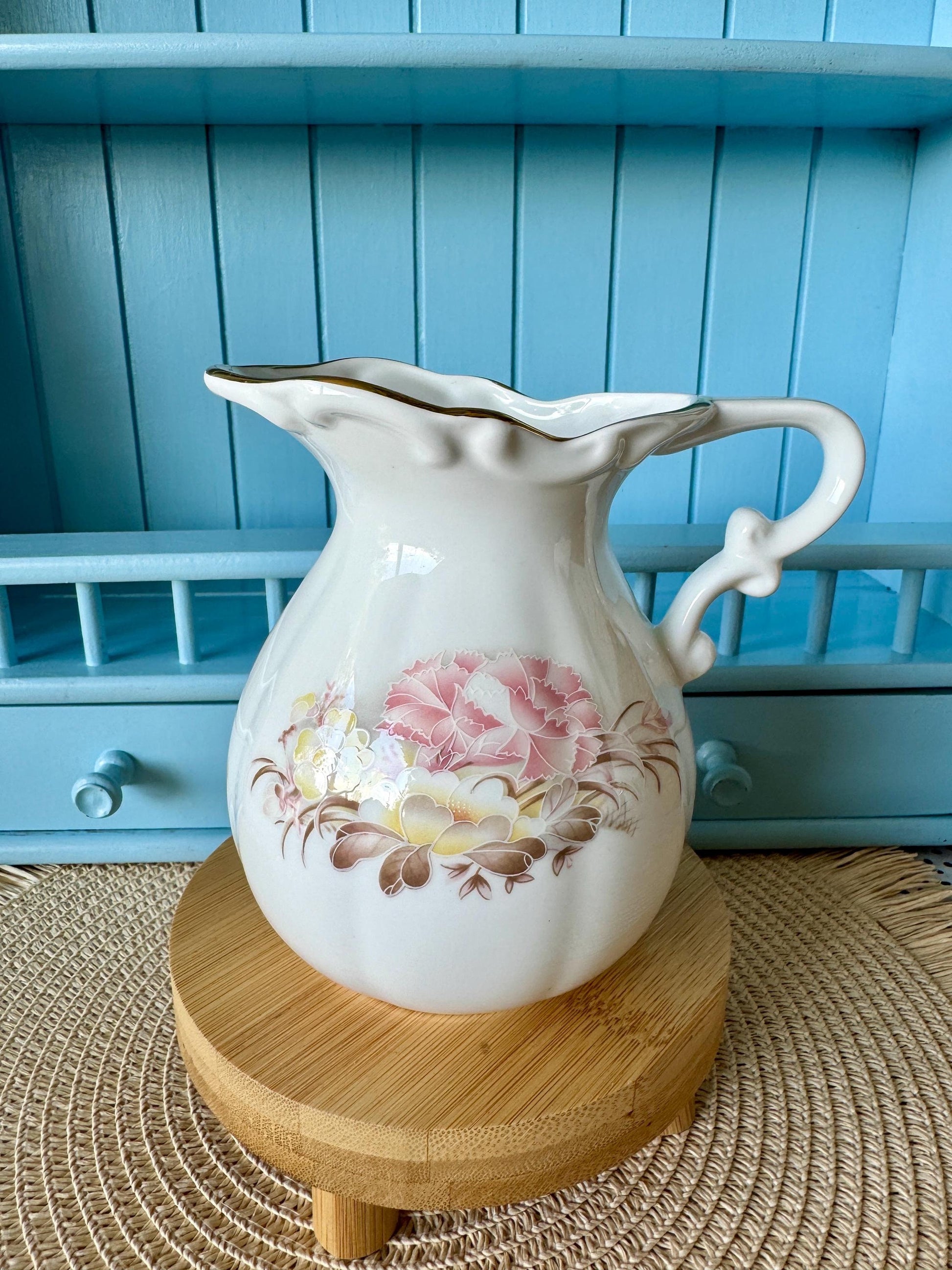 ✨ Rare Vintage Astbury, Royal Albert Works Full Size Creamer or Water Jug ✨ Staffordshire Pitcher with Pink and Yellow Floral Decor, Made in England ✨ This exquisite vintage cream pitcher is a true collector's item. Crafted by Astbury, Royal Albert Works, this Staffordshire piece features a beauti...
