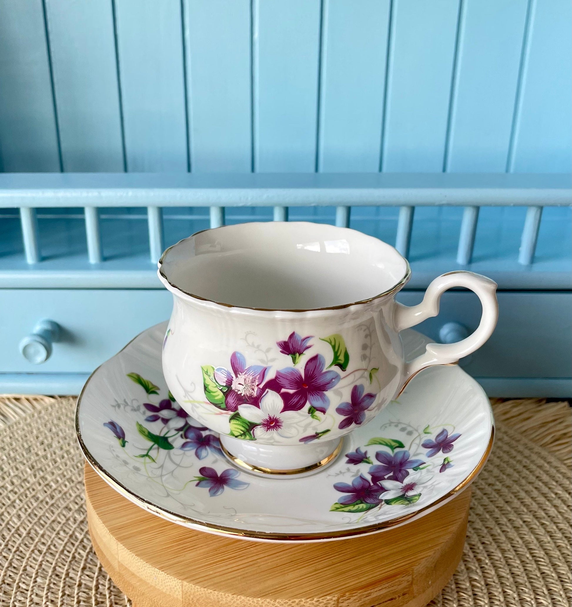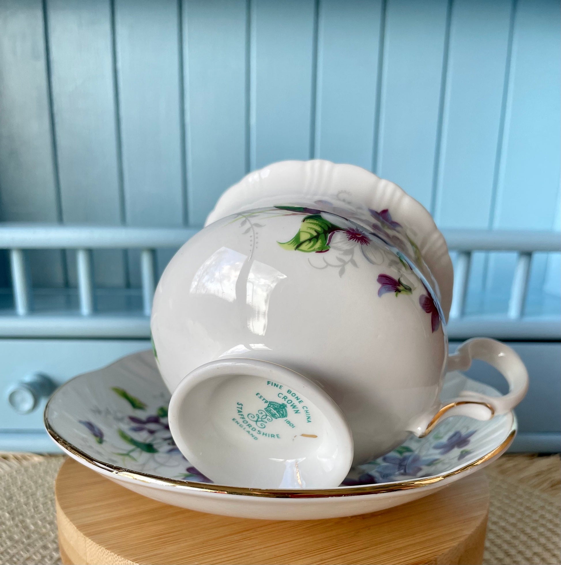 Vintage Crown Staffordshire Tea Cup and Saucer, Purple Pansies, Fine Bone China, Previously Loved Antique Tea, For High-Tea, Made in England