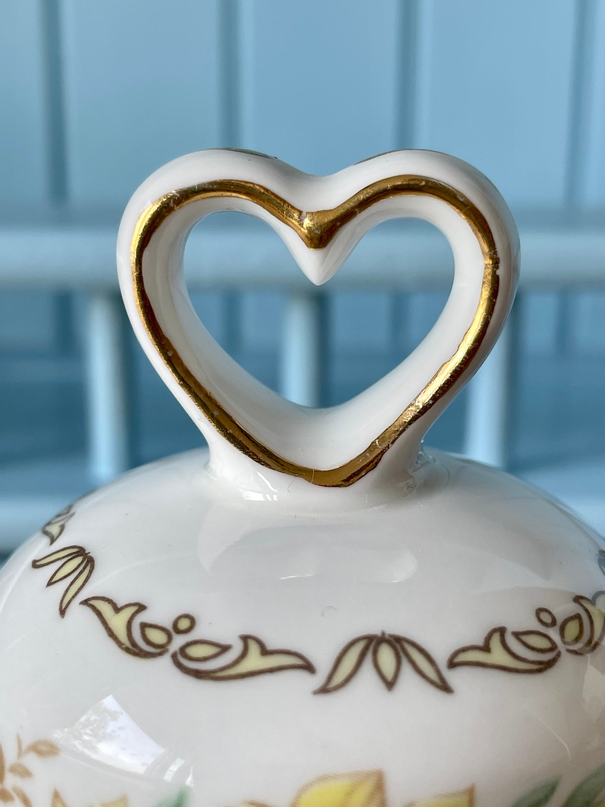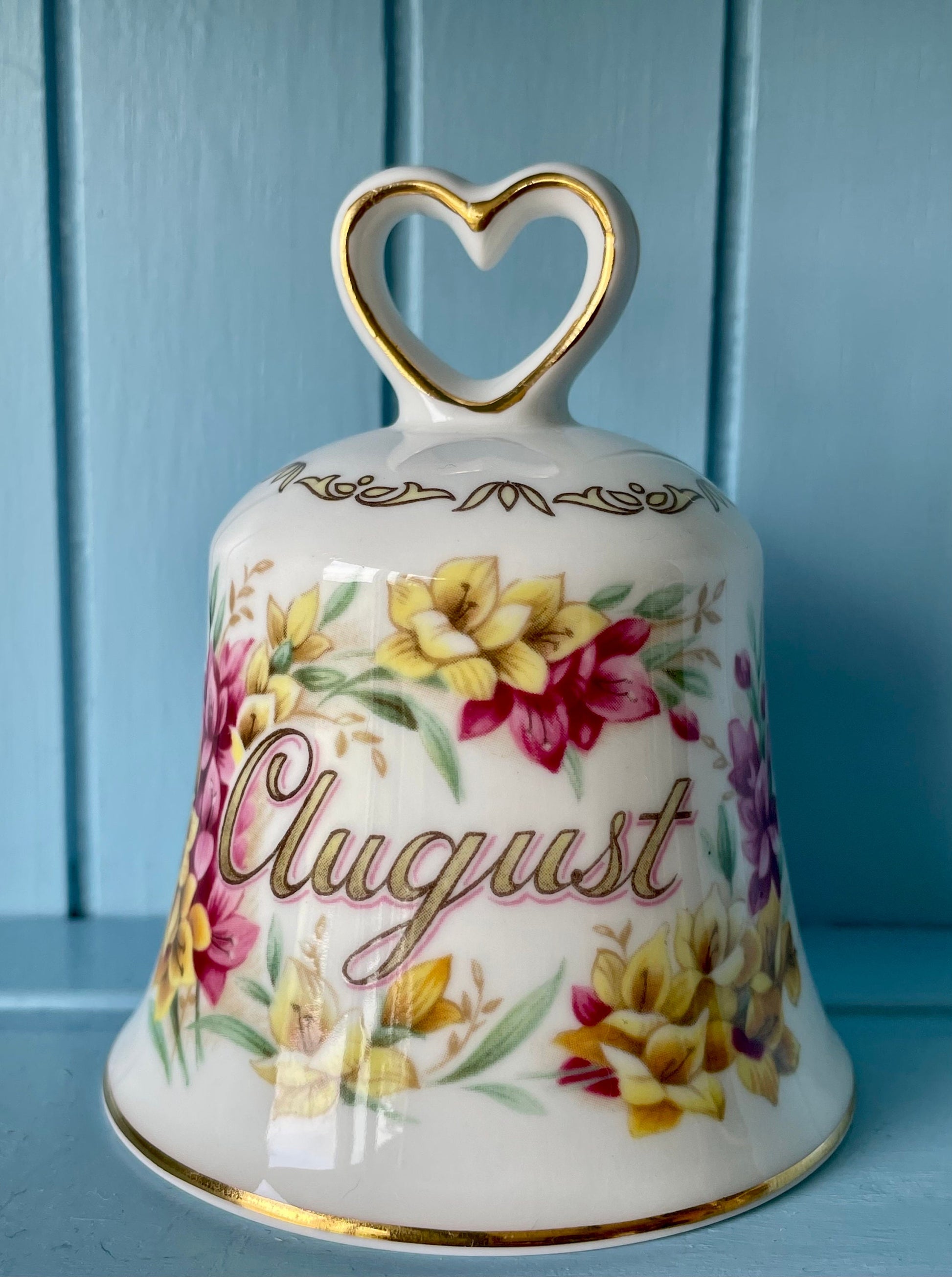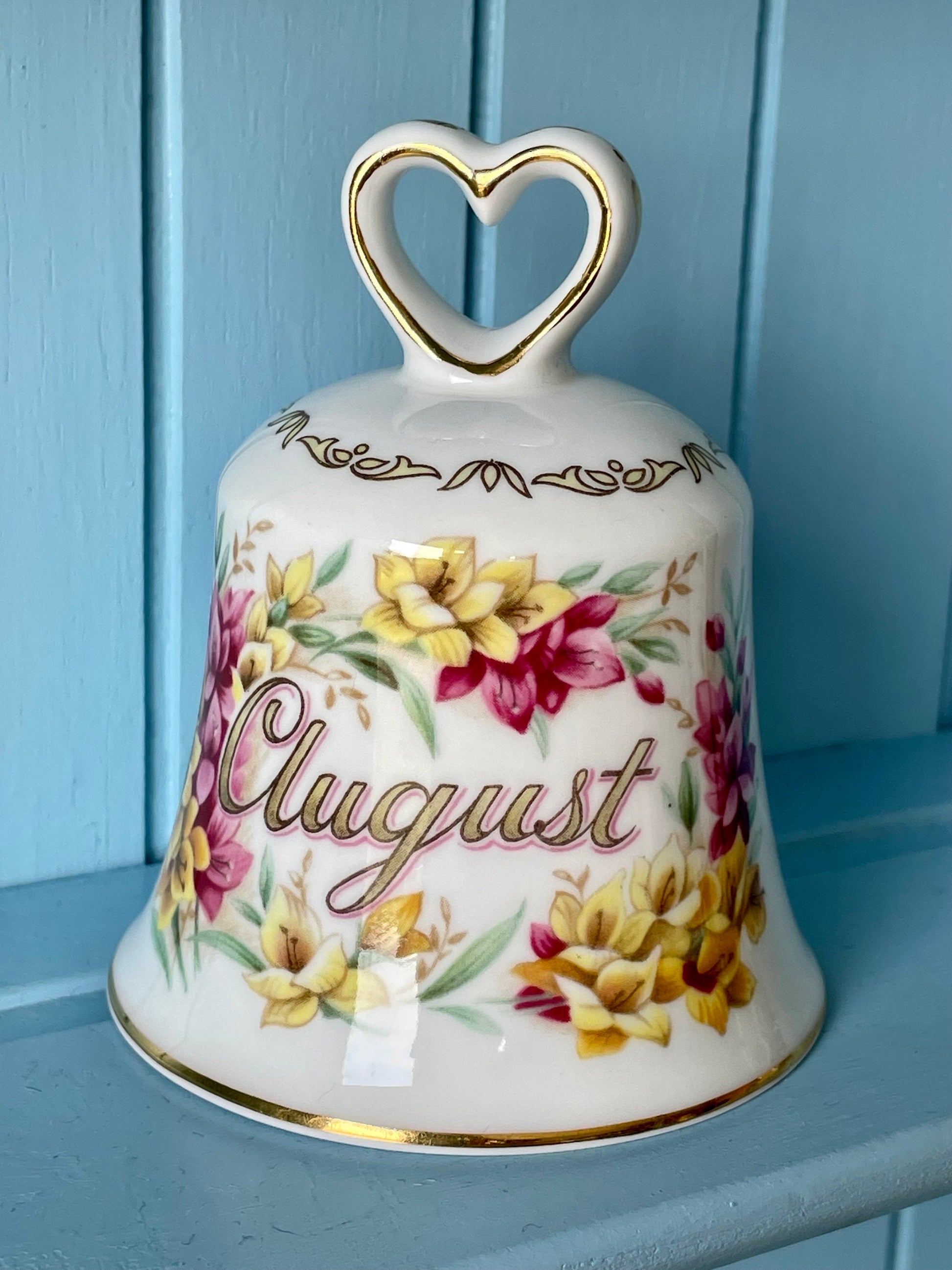 Presenting the Golden Crown Fine China England Bell, a perfect symbol of elegance and celebration for the month of August πΌπ. This exquisite bell boasts a heart-shaped top adorned with delicate golden gilt and showcases vibrant yellow and pink flowers in all their glory π»πΈ.
