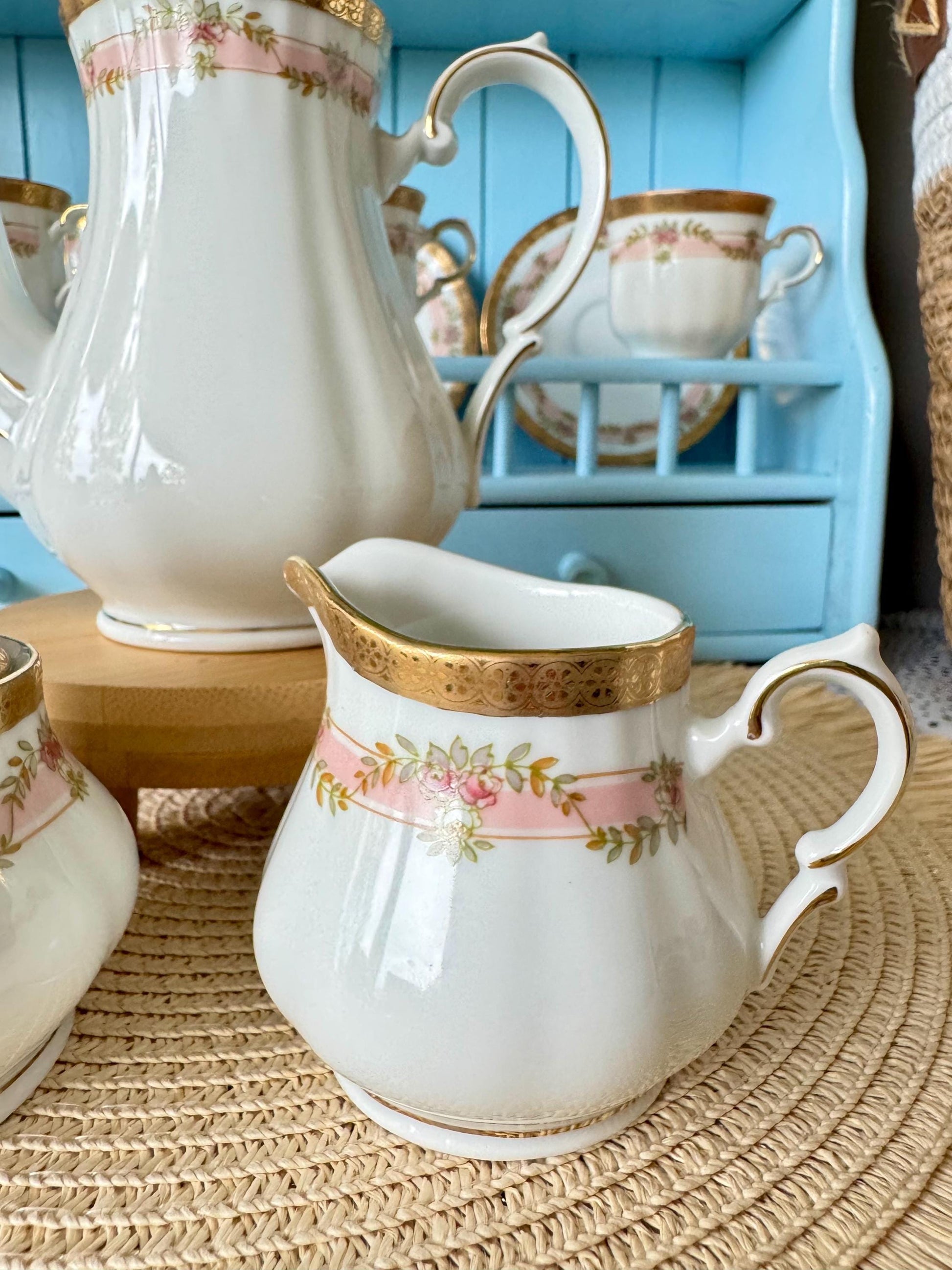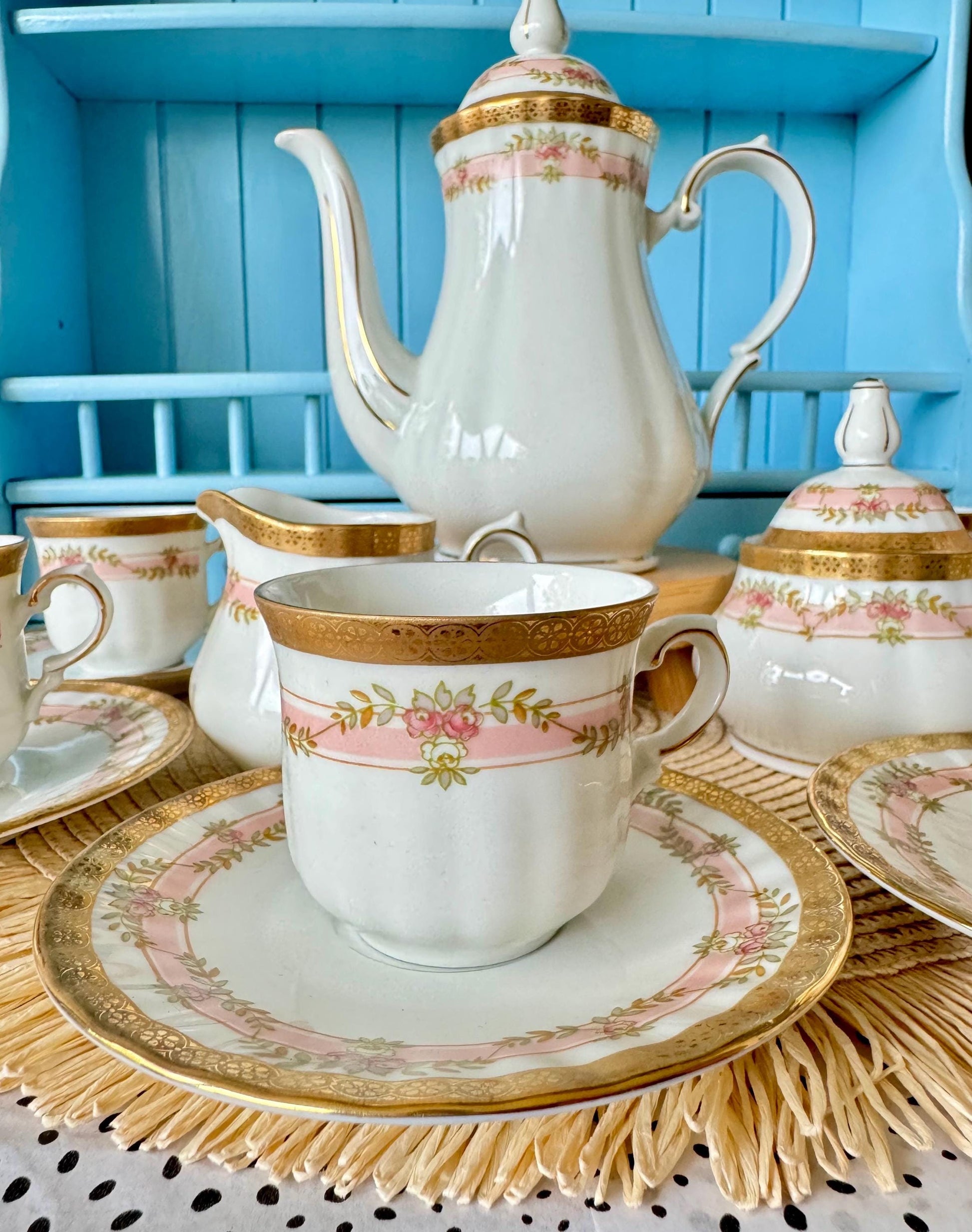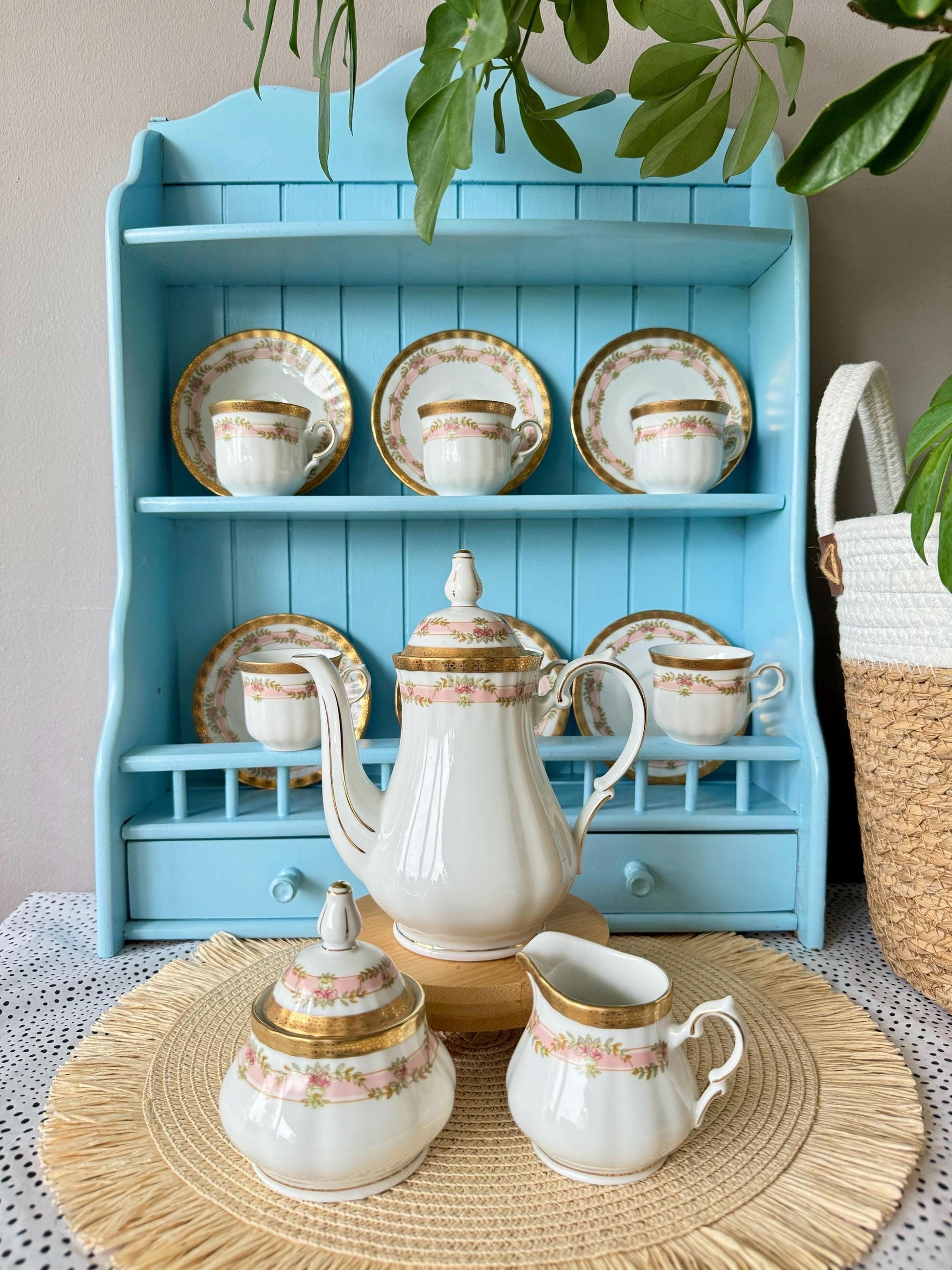💖 Charming Vintage Kronester Mokka Set from West Germany 💖 Discover timeless beauty with this exquisite vintage Kronester mokka set, handcrafted in West Germany. Featuring a delicate pink hue and adorned with graceful rose motifs, this set exudes classic charm. The lavish gold gilding adds a touch ...