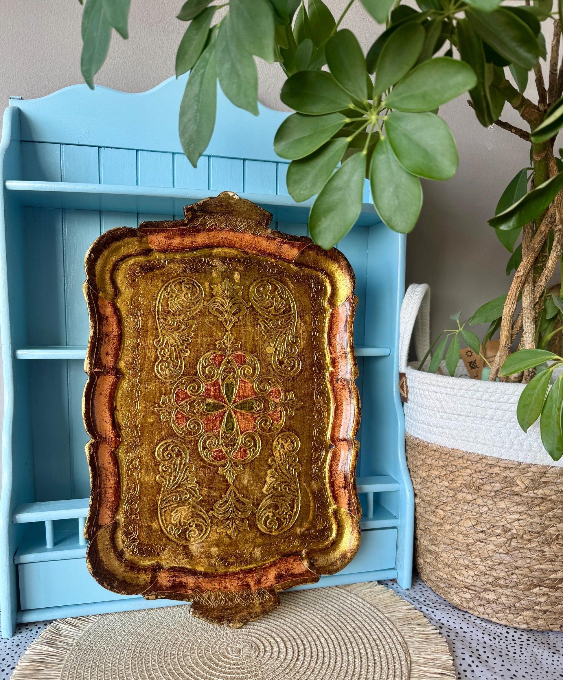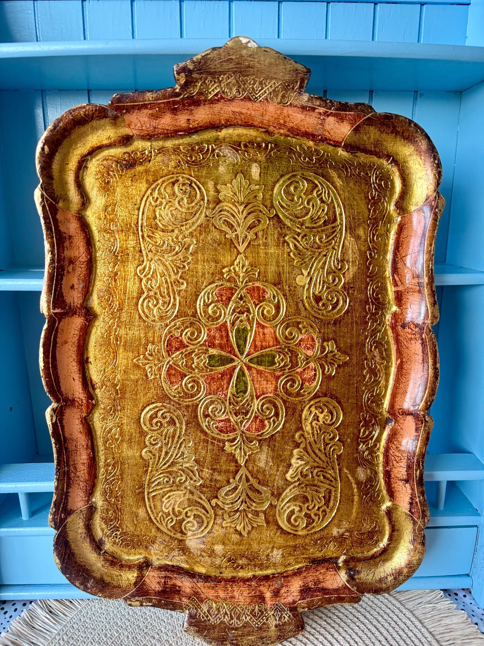 ✨ Vintage Italian Florentine Serving Tray (Hand-Painted) ✨ Enchant your guests with this exquisite vintage serving tray, handcrafted in Italy during the 1960s. Featuring a captivating hand-painted design with light green, pink and gold accents, this tray embodies the artistry of Florentine traditi...