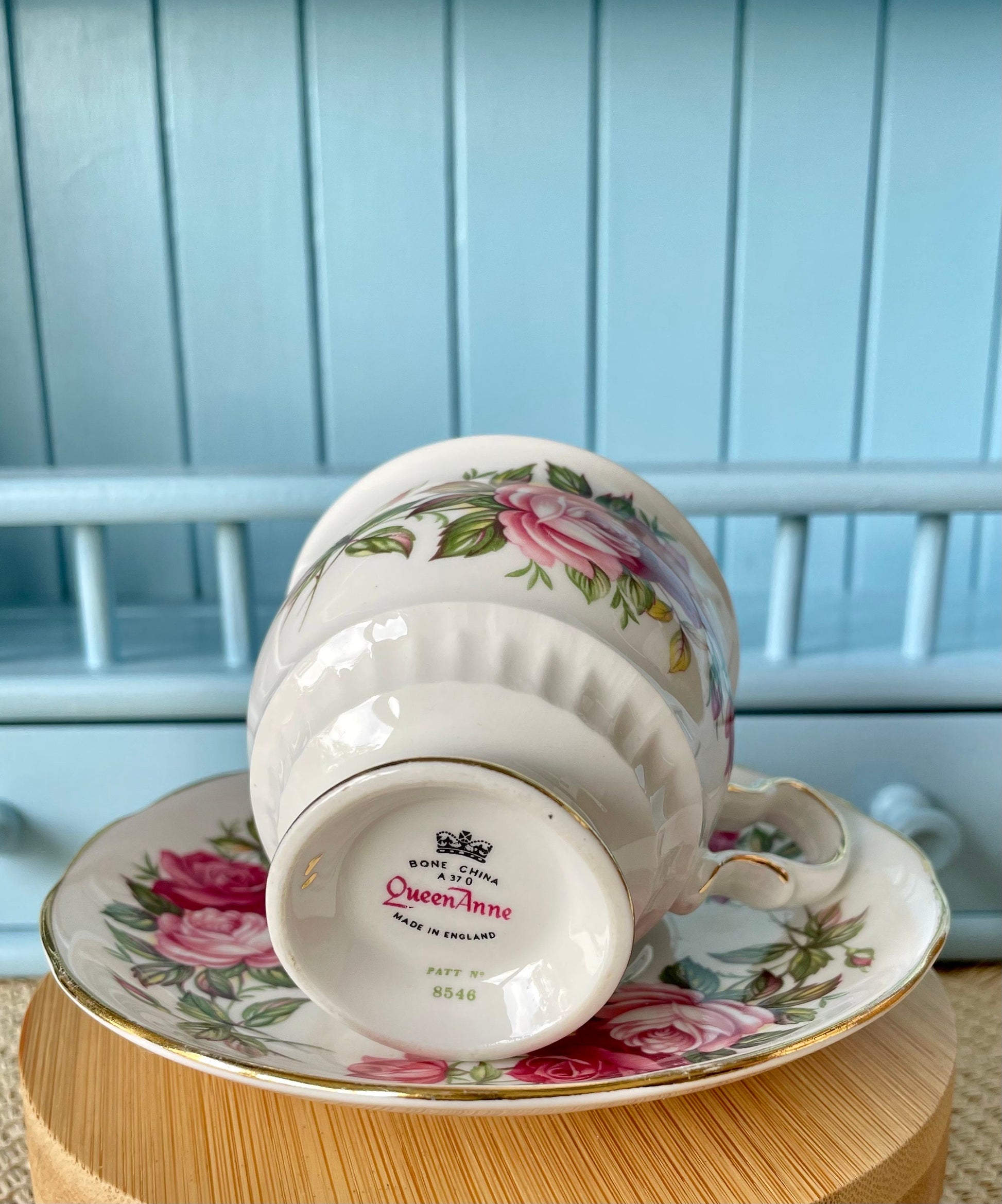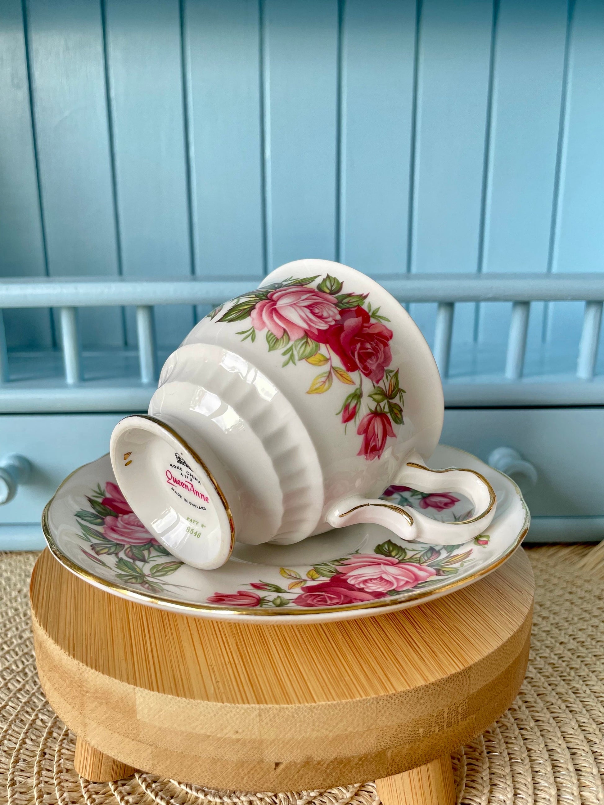 Introducing the Queen Anne Red and Pink Roses Tea Cup and Saucer, a Vintage Delight with a beautiful ribbed edge on the bottom of the cup.