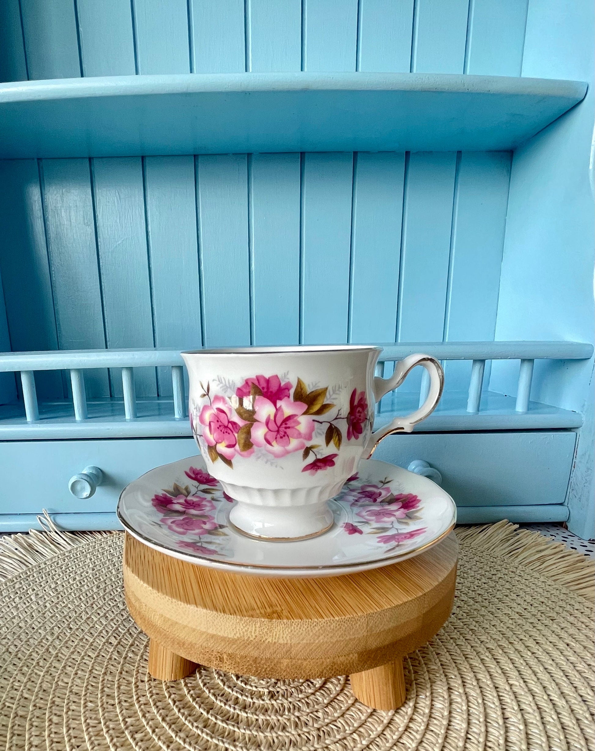 Introducing the Queen Anne Cherry Blossom Tea Cup and Saucer, a Vintage Delight