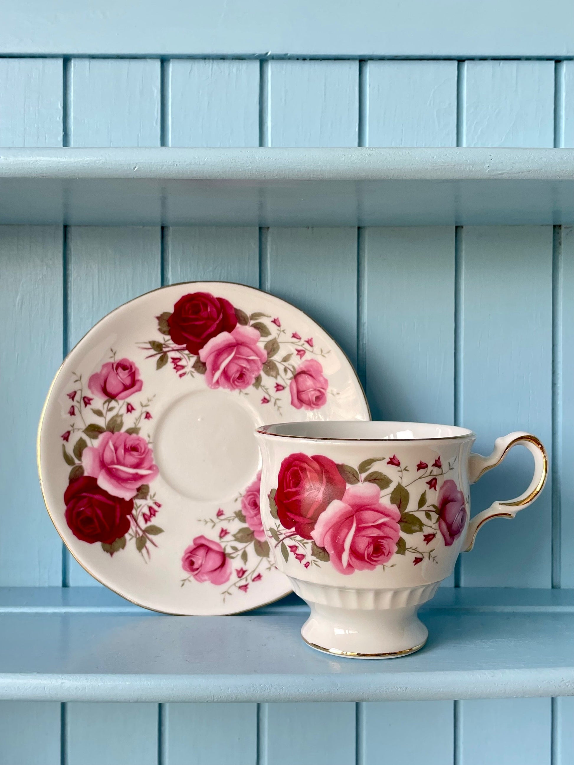 Elevate your tea moments with the exquisite Queen Anne Red and Pink Roses Tea Cup and Saucer.