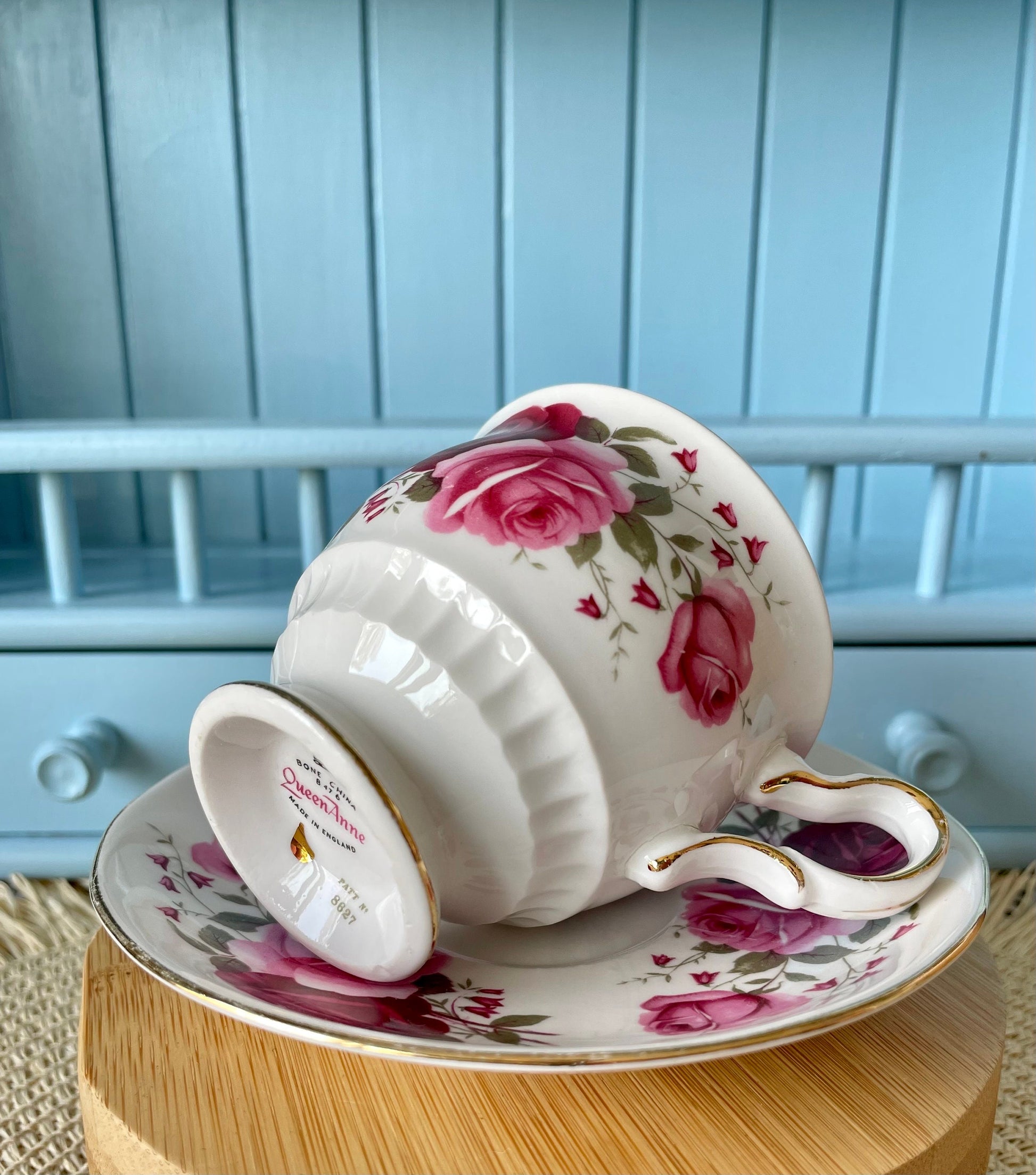 Vintage Queen Anne, Pink and Red Roses Floral Bone Tea Cup and Saucer, Antique English China, Previously Loved, Ribbed Cup, Made in England