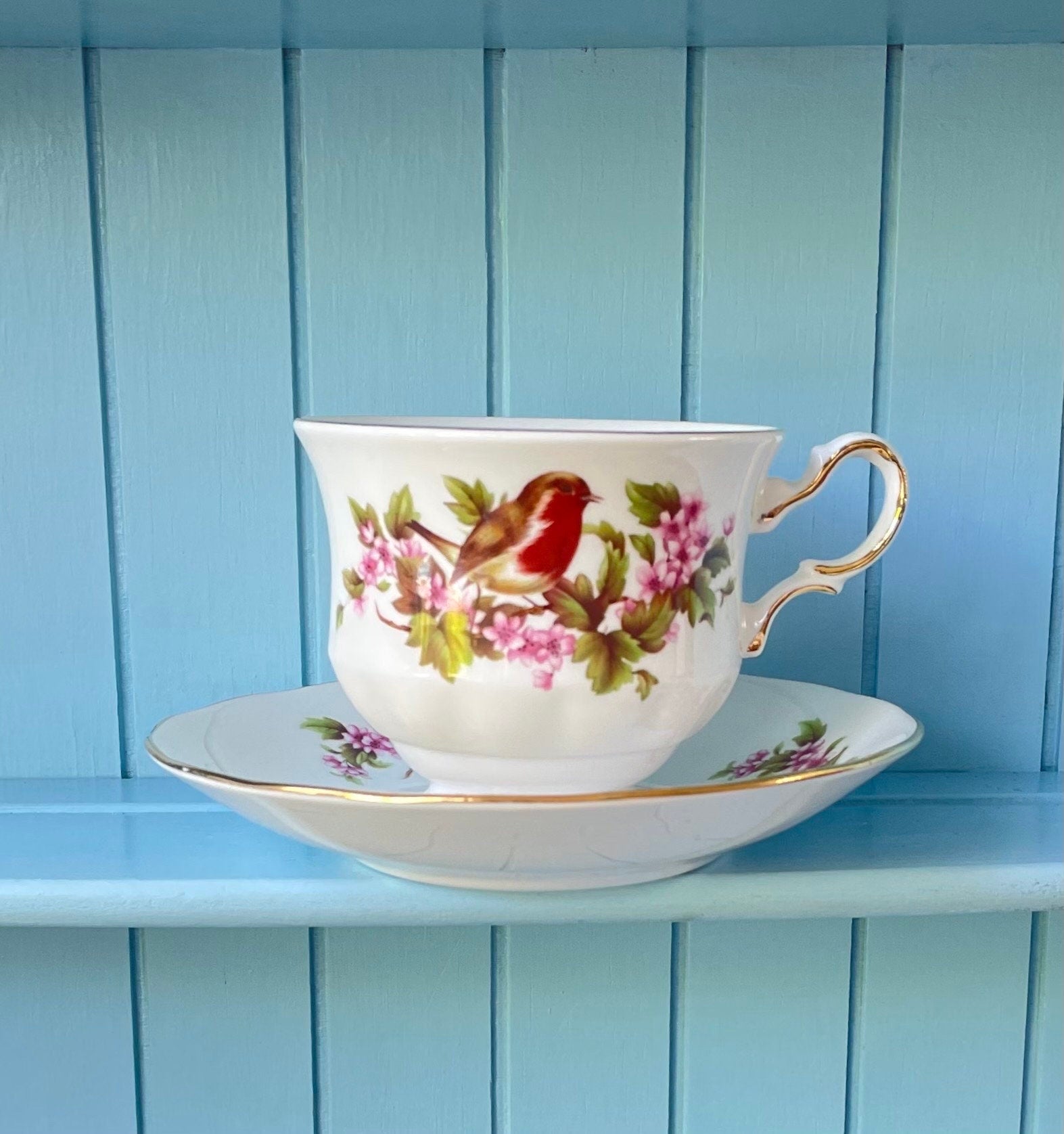 Vintage Queen Anne Robin, Pink Floral Bone Tea Cup and Saucer, Antique English China, Previously Loved Vintage Cup, High-Tea Bridal Party