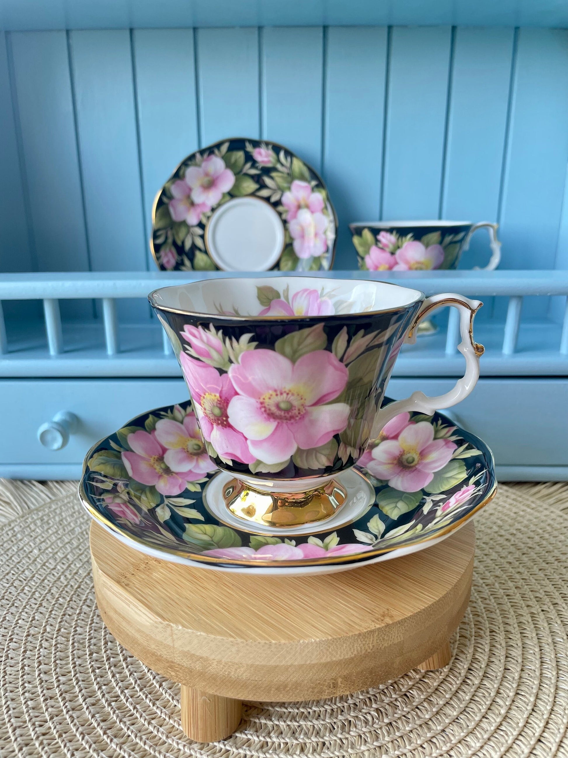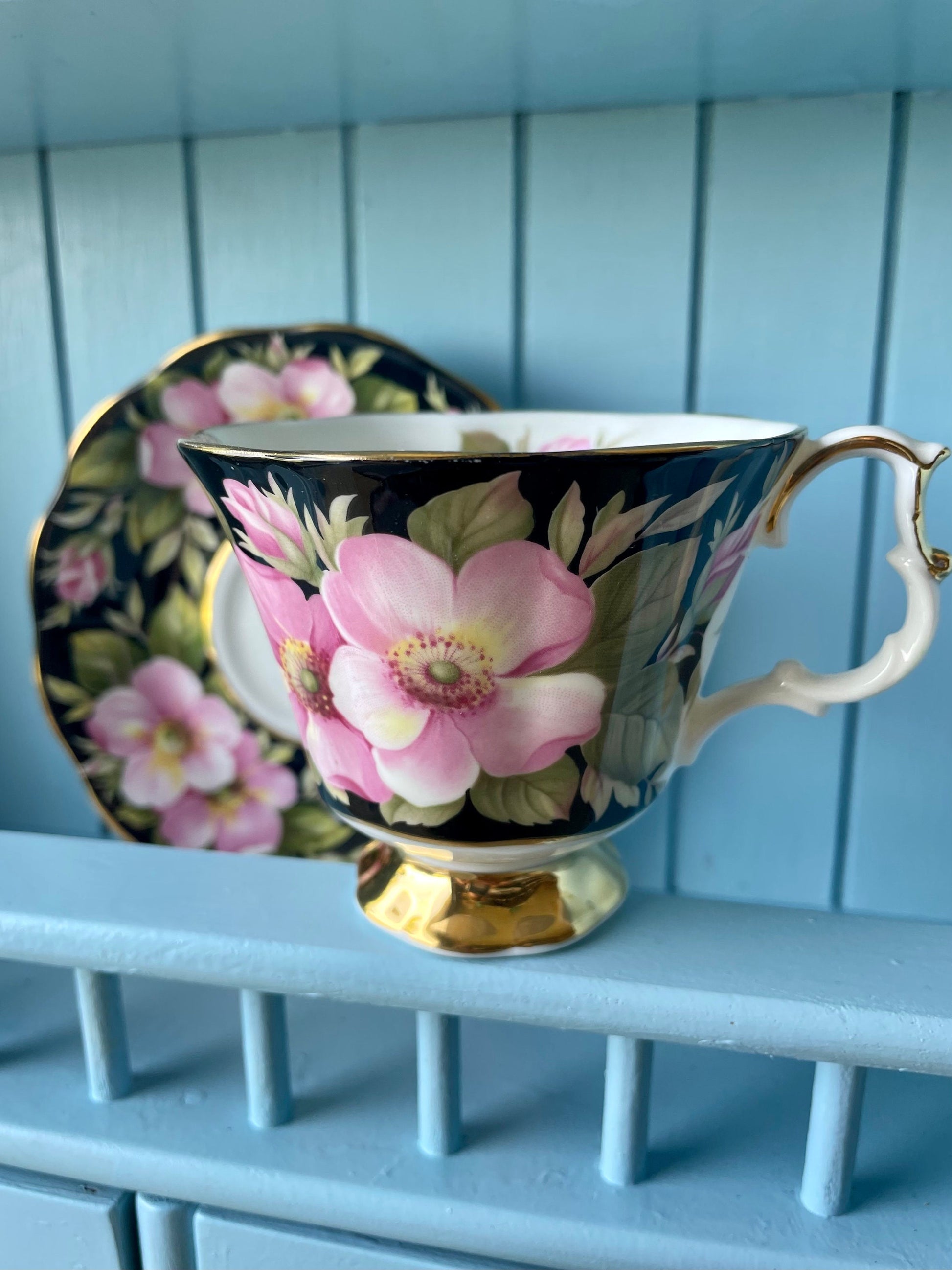 All pieces are decorated by large Pink Wild Rose flowers surrounded by green foliage, situated against contrasting black background; both pieces are trimmed in gold.