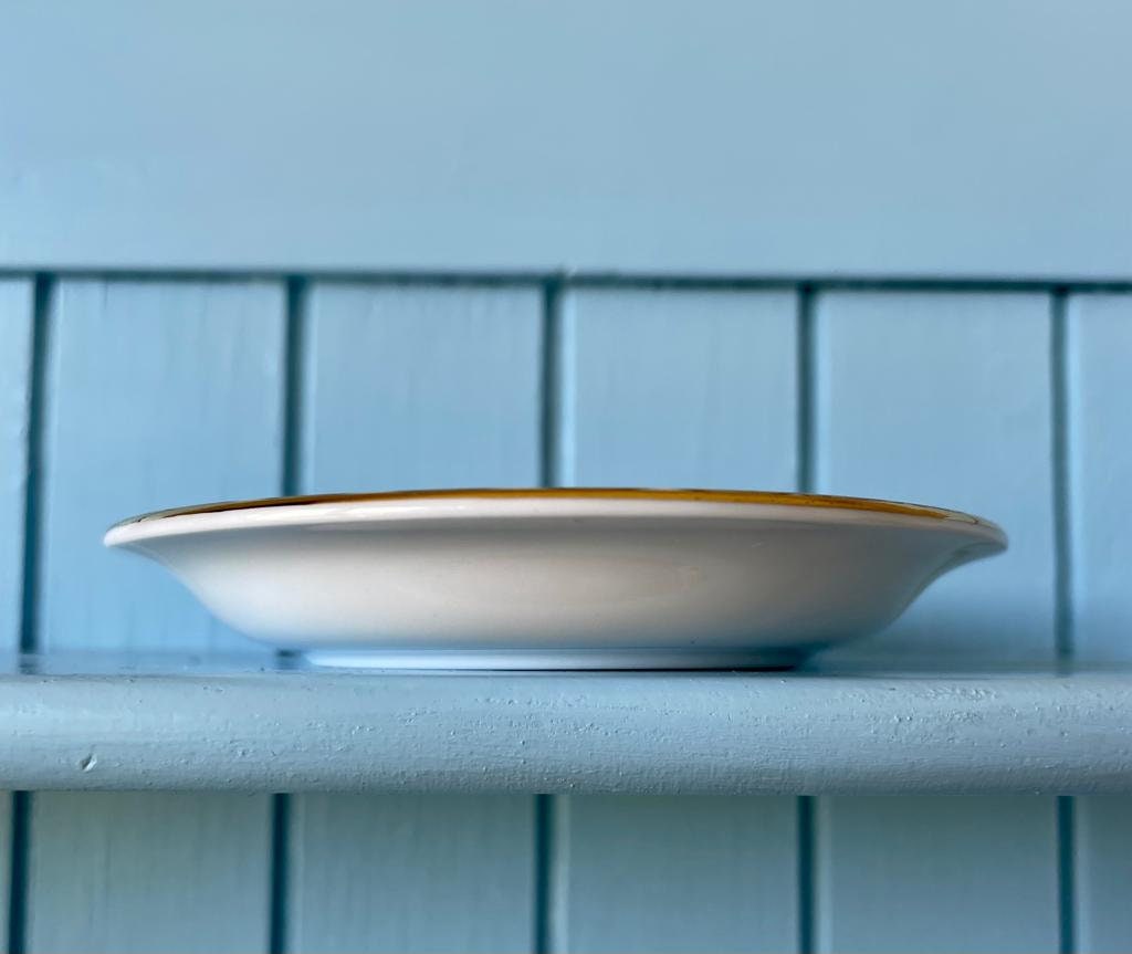 The dish is in excellent vintage condition with no chips, cracks or crazing, and has a lovely ping. Gold is bright and intact. Please inspect photos carefully as they are part of the description.