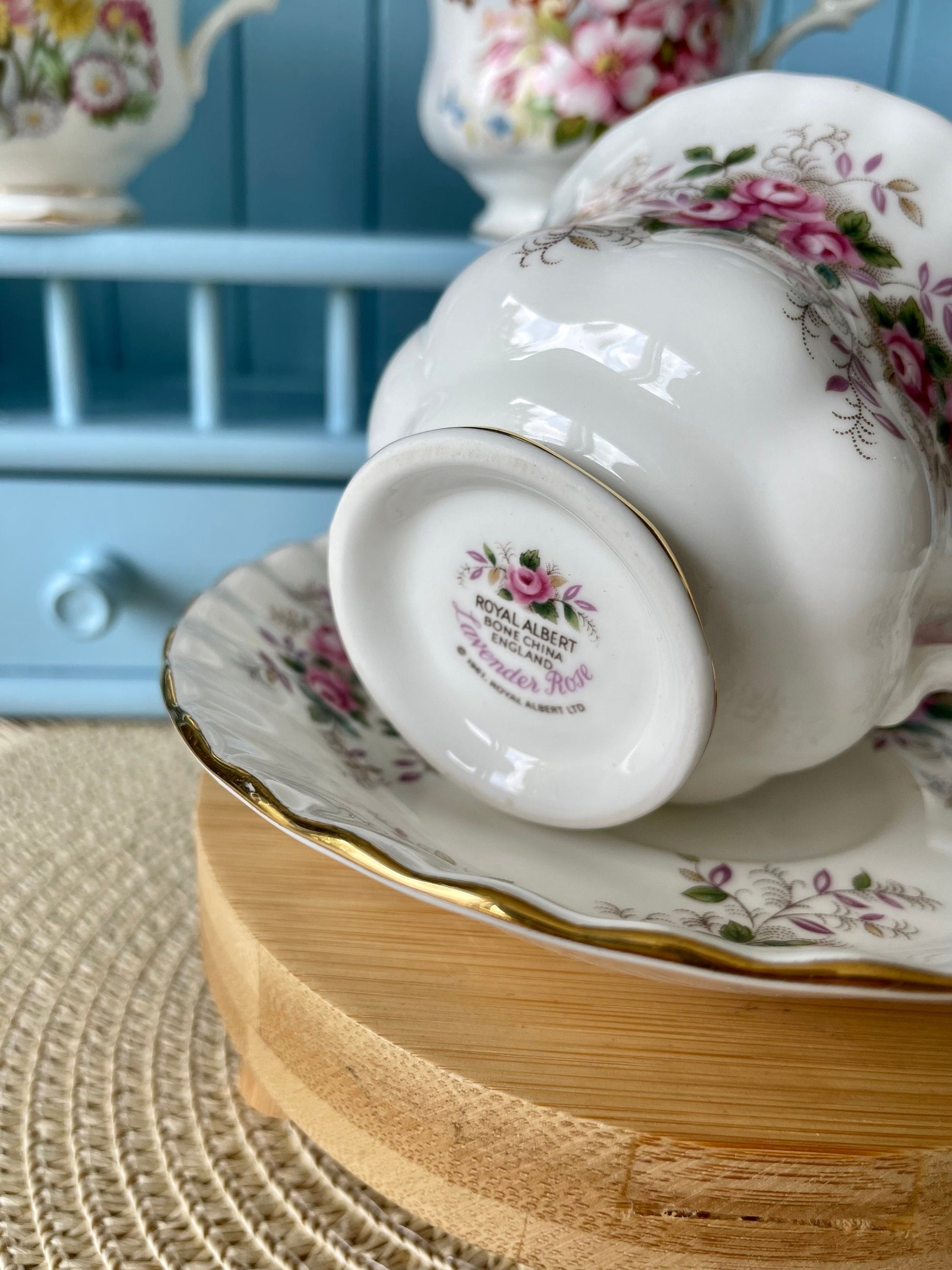 This is a teacup and saucer made in England by Royal Albert in the Lavender Rose pattern.