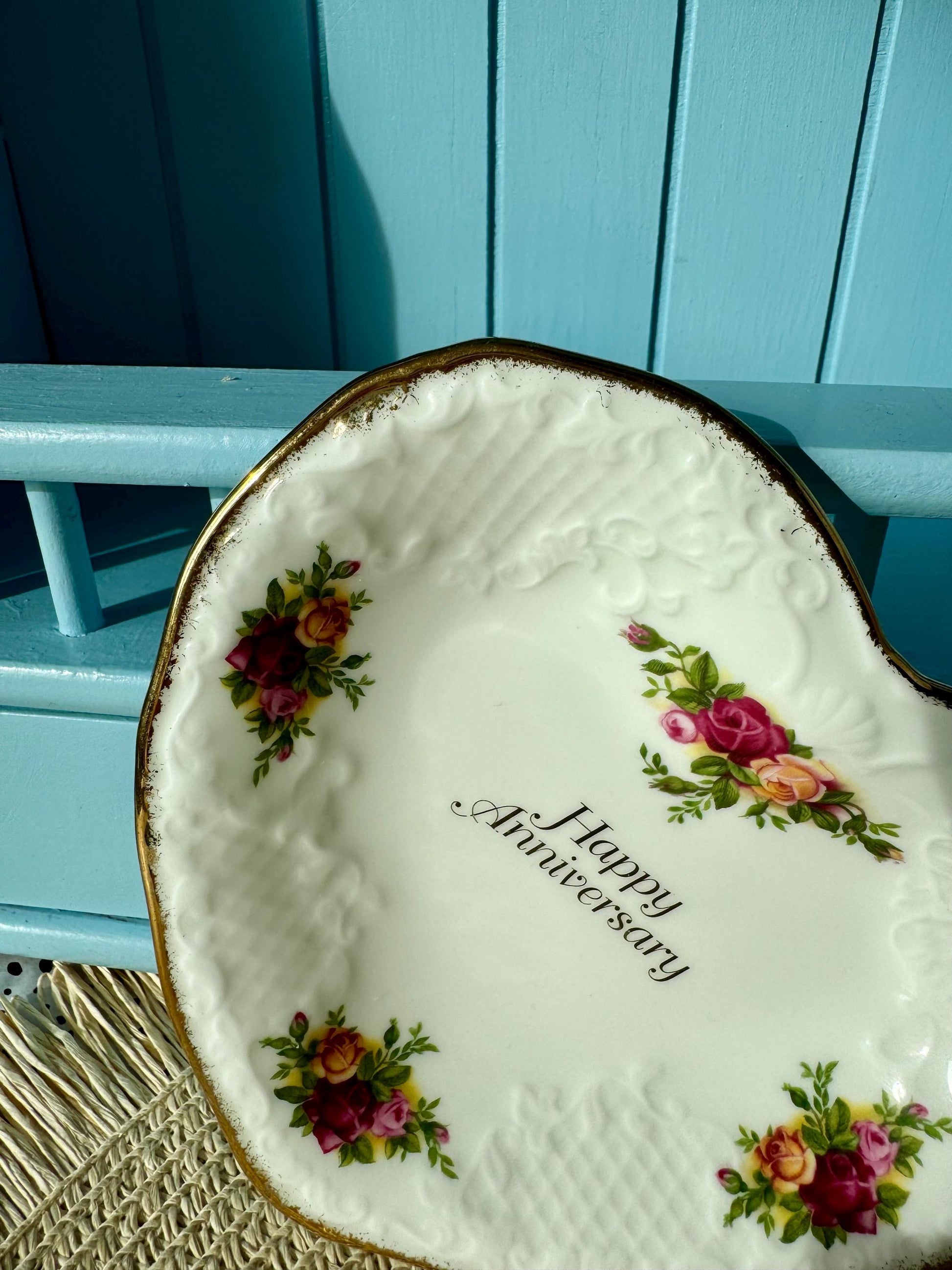 Measuring approximately 5.5 inches across, it features the iconic Old Country Roses pattern in vibrant hues. The inscription "Happy Anniversary" adds a loving touch, making it a sentimental keepsake.
