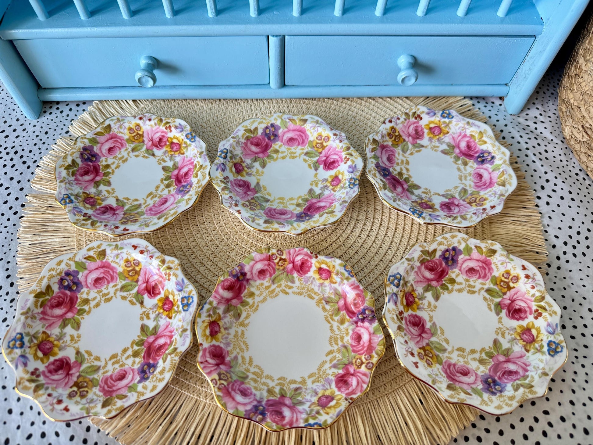 This lovely set includes six pre-owned, gently used dishes in perfect vintage condition, with one featuring a slightly different design, likely from a different manufacturing period. It adds character and a touch of uniqueness to the collection!