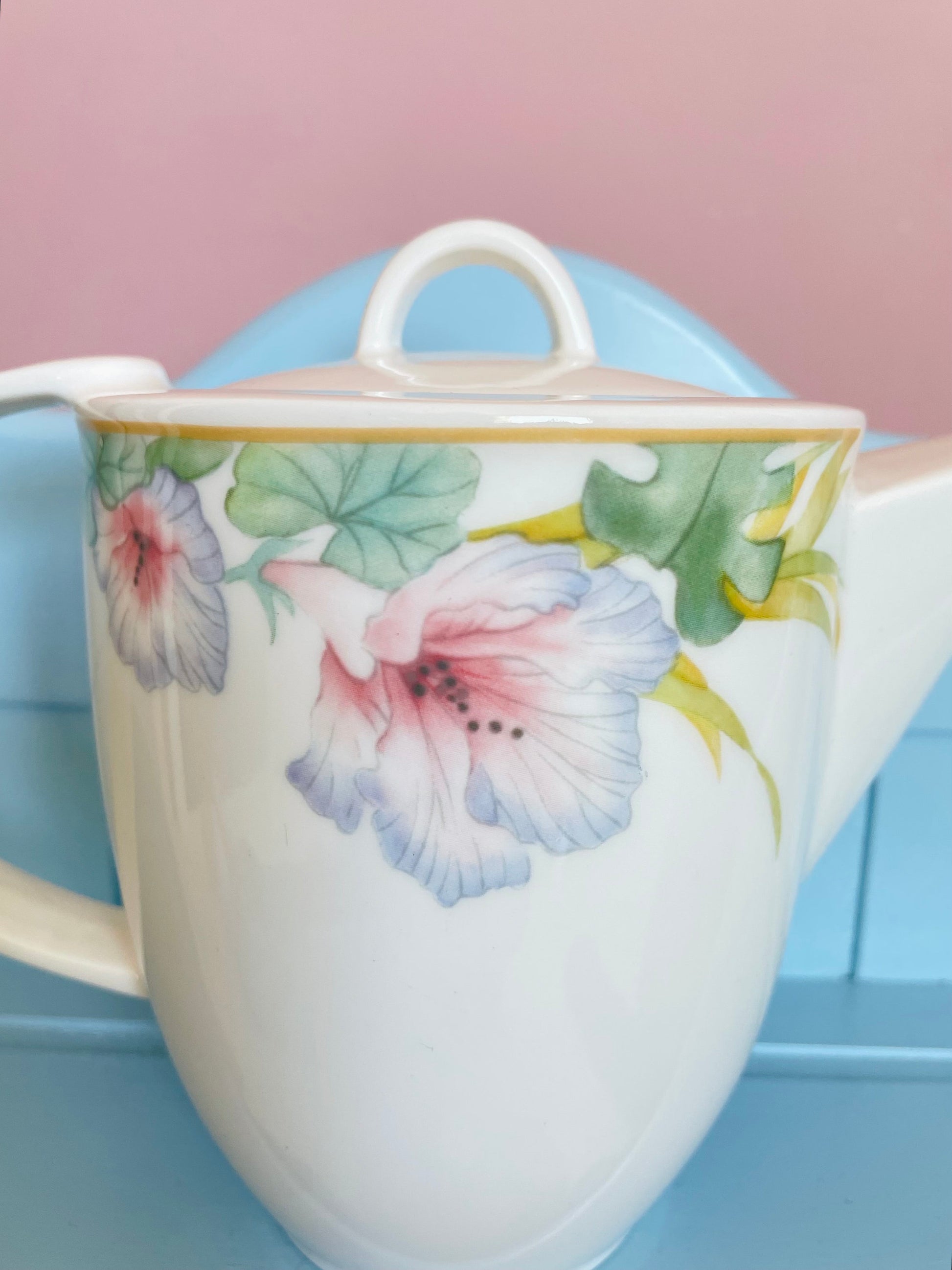 Behold the magnificence of the Villeroy & Boch Exotica Series Teapot and Teacup Set - an embodiment of sheer elegance and style. This striking collection, reminiscent of the Art Nouveau era with a hint of '80s flair, is a genuine collector's gem. Crafted with meticulous attention to detail, the teap...