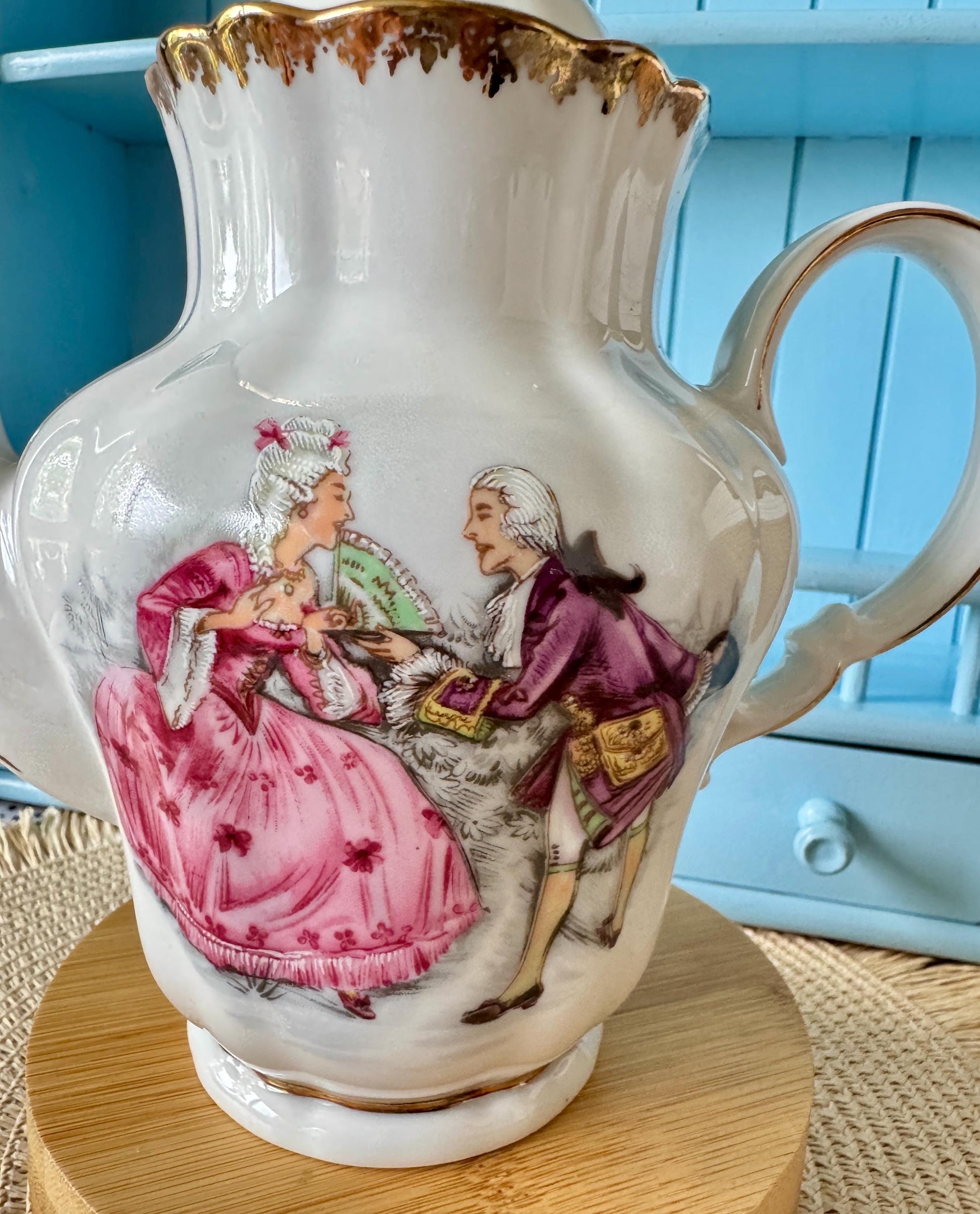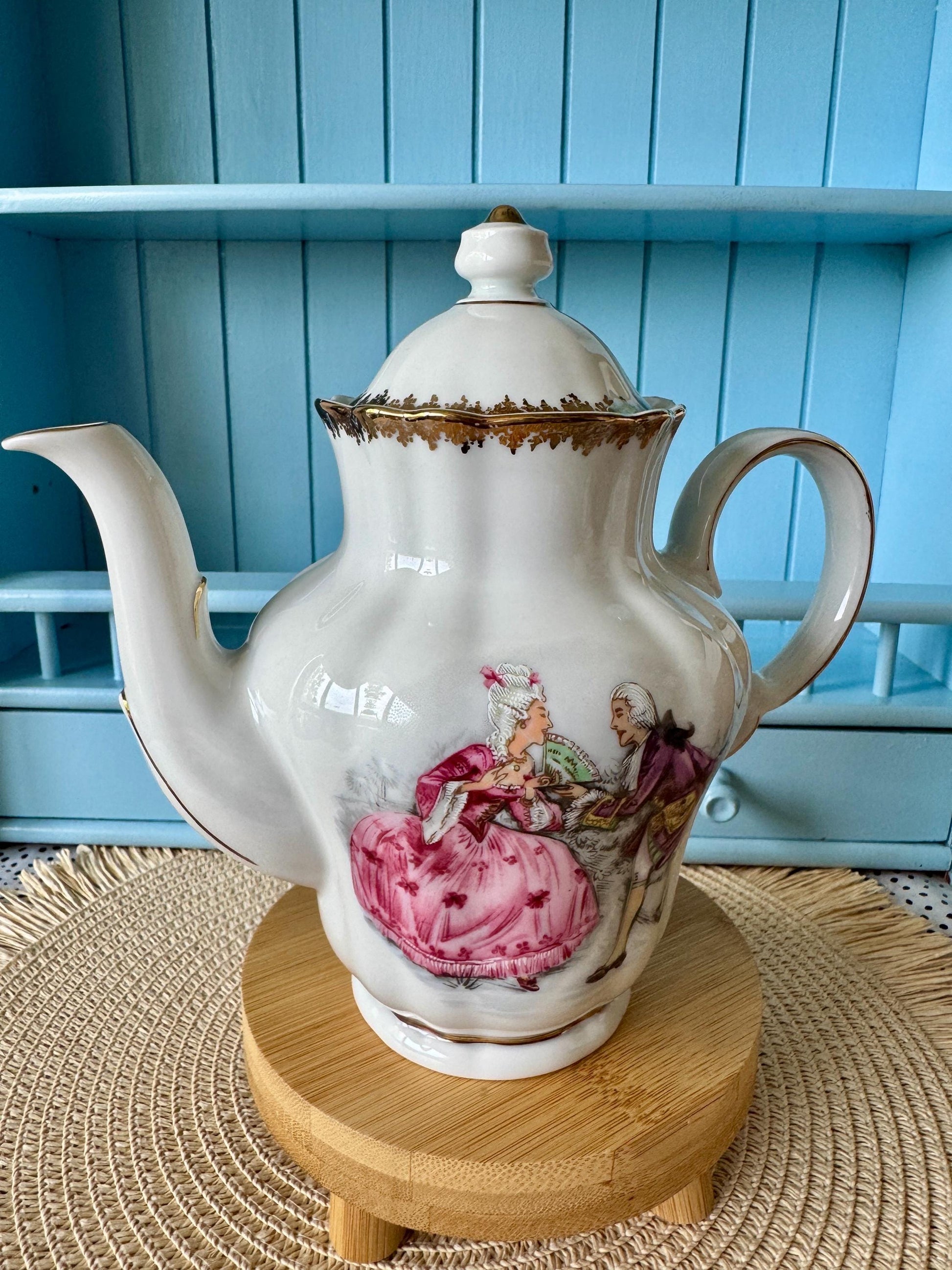 Vintage Winterling Coffee Pot — Fall in love with vintage romance. This charming Winterling Markleuthen Bavaria coffee pot features a beautifully detailed Fragonard-style courting scene, capturing the elegance and whimsy of days gone by. The rich hues of deep pink, plum, and soft pastels combined w...